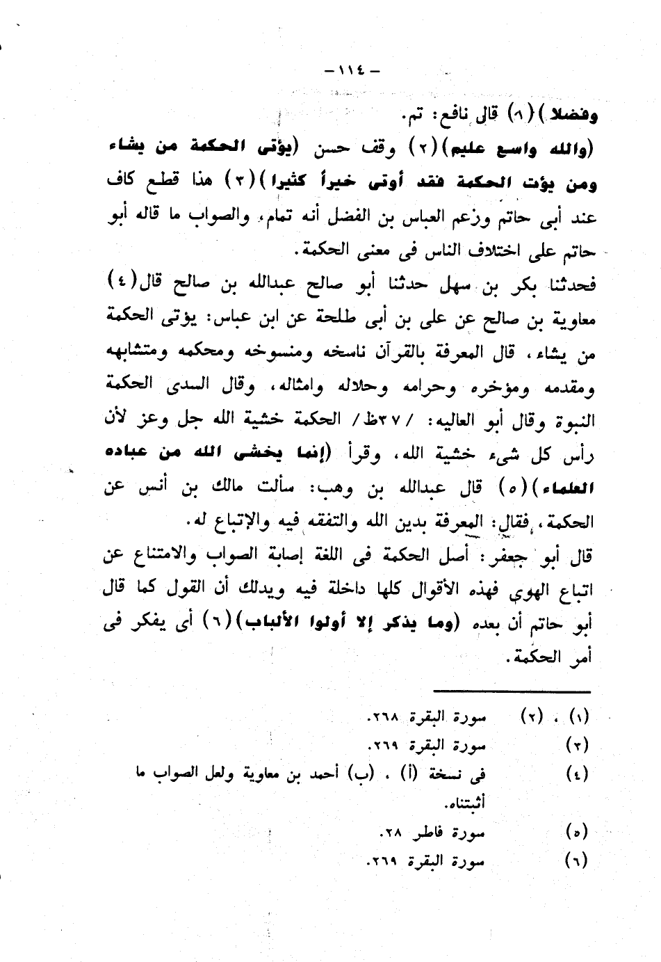 فحدثنا بكر بن سهل حدثنا أبو صالح عبد الله بن صالح قال معاوية بن صالح عن علي بن أبي طلحة عن ابن عباس: يؤتي الحكمة من يشاء، قال المعرفة بالقرآن ناسخه ومنسوخه ومحكمه ومتشابهه ومقدمه ومؤخره وحرامه وحلاله وأمثاله، وقال السدي الحكمة النبوة وقال أبو العاليه: الحكمة خشية الله جل وعز لأن رأس كل شيء خشية الله، وقرأ {إنما يخشى الله من عباده العلماء} قال عبد الله بن وهب: سألت مالك بن أنس عن الحكمة، فقال: المعرفة بدين الله والتفقه فيه والاتباع له.