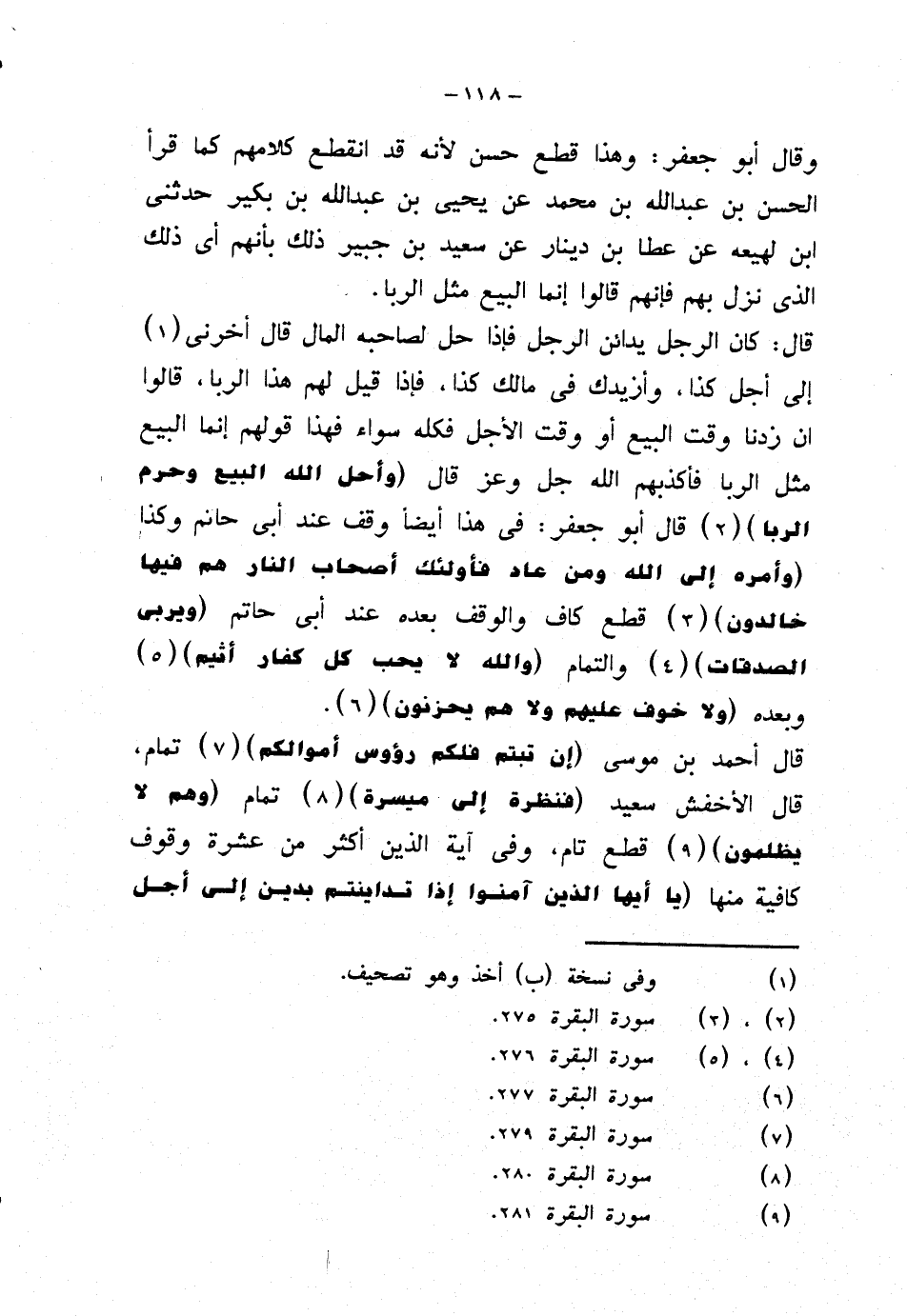قال أحمد بن موسى {إن تبتم فلكم رؤوس أموالكم} تمام، قال الأخفش سعيد {فنظرة إلى ميسرة} تمام {وهم لا يظلمون} قطع تام، وفي آية الذين أكثر من عشرة وقوف كافية منها {يا أيها الذين آمنوا إذا تداينتم بدين إلى أجل
