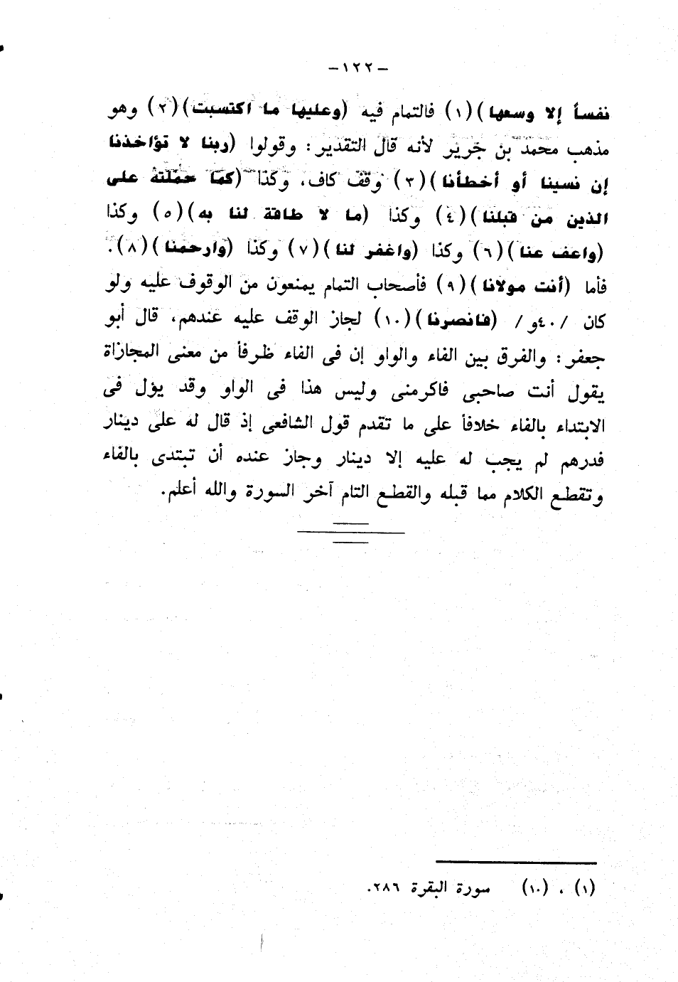 نفسًا إلا وسعها} فالتمام فيه {وعليها ما اكتسبت} وهو مذهب محمد بن جرير لأنه قال التقدير: وقولوا {ربنا لا تؤاخذنا إن نسينا أو أخطأنا} وقف كاف، وكذا {كما حملته على الذين من قبلنا} وكذا {ما لا طاقة لنا به} وكذا {واعف عنا} وكذا {واغفر لنا} وكذا {وارحمنا}.