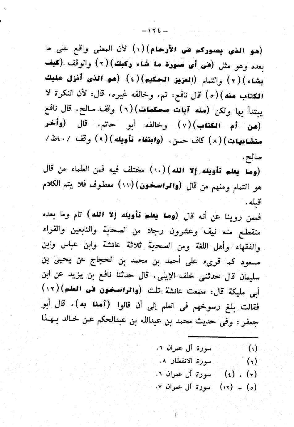 {وما يعلم تأويله إلا الله} مختلف فيه فمن العلماء من قال هو التمام ومنهم من قال {والراسخون} معطوف فلا يتم الكلام قبله.