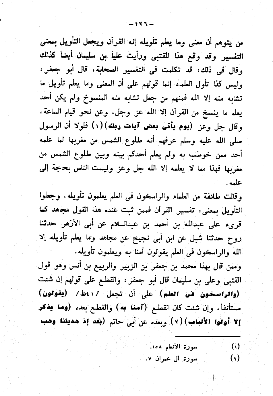 من يتوهم أن معنى وما يعلم تأويله إنه القرآن ويجعل التأويل بمعنى التفسير وقد وقع هذا للقتبي ورأيت عليًا بن سليمان أيضًا كذلك وقال في ذلك: قد تكلمت في التفسير الصحابة، قال أبو جعفر: وليس كذا تأول العلماء إنما قولهم على أن المعنى وما يعلم تأويل ما تشابه منه إلا الله فمنهم من جعل تشابه منه المنسوخ ولم يكن أحد يعلم ما ينسخ من القرآن إلا الله عز وجل، وعن نحو قيام الساعة، وقال جل وعز {يوم يأتي بعض آيات ربك} فلولا أن الرسول صلى الله عليه وسلم عرفهم أنه طلوع الشمس من مغربها لما علمه أحد ممن خوطب به ولم يعلم أحدكم بينه وبين طلوع الشمس من مغربها فهذا مما لا يعلمه إلا الله جل وعز وليست الناس بحاجة إلى علمه.
