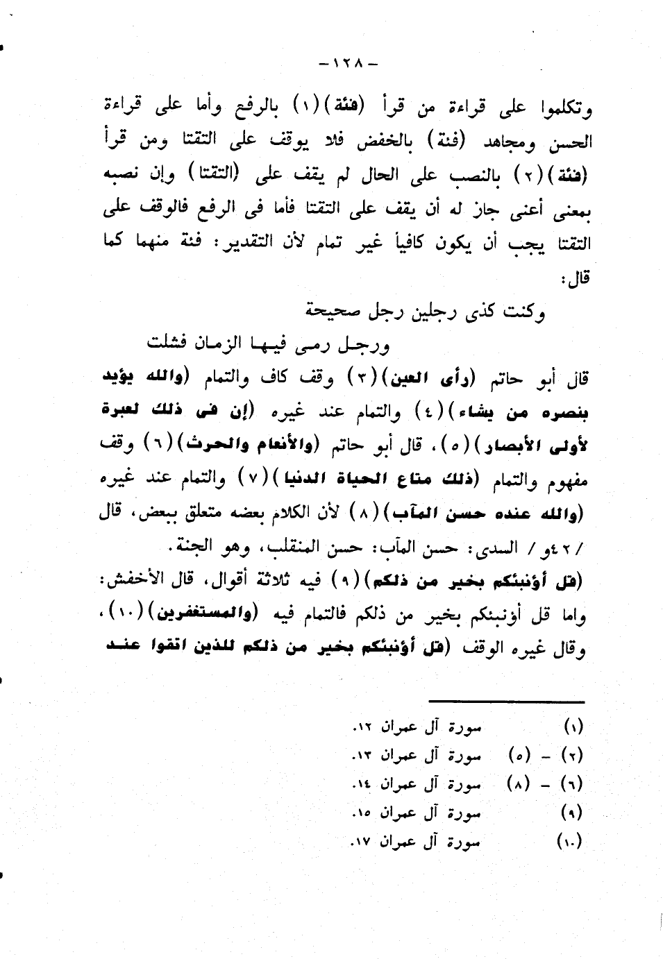 قال أبو حاتم {رأي العين} وقف كاف والتمام {والله يؤيد بنصره من يشاء} والتمام عند غيره {إن في ذلك لعبرة لأولي الأبصار}، قال أبو حاتم {والأنعام والحرث} وقف مفهوم والتمام {ذلك متاع الحياة الدنيا} والتمام عند غيره {والله عنده حسن المآب} لأن الكلام بعضه متعلق ببعض، قال السدي: حسن المآب: حسن المنقلب، وهو الجنة.