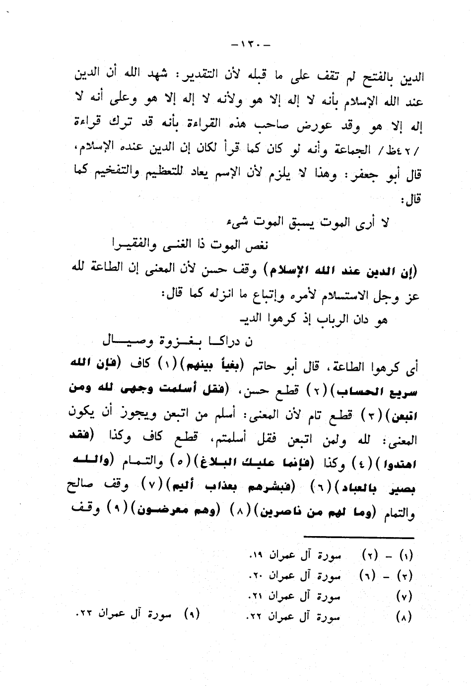 أي كرهوا الطاعة، قال أبو حاتم {بغيًا بينهم} كاف {فإن الله سريع الحساب} قطع حسن، {فقل أسلمت وجهي لله ومن اتبعن} قطع تام لأن المعنى: أسلم من اتبعن ويجوز أن يكون المعنى: لله ولمن اتبعن فقل أسلمتم، قطع كاف وكذا {فقد اهتدوا} وكذا {فإنما عليك البلاغ} والتمام {والله بصير بالعباد} {فبشرهم بعذاب أليم} وقف صالح والتمام {وما لهم من ناصرين} {وهم معرضون} وقف