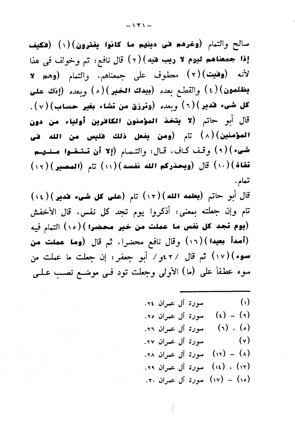 صالح والتمام {وغرهم في دينهم ما كانوا يفترون} {فكيف إذا جمعناهم ليوم لا ريب فيه} قال نافع: تم وخولف في هذا لأنه {وفيت} معطوف على جمعناهم، والتمام {وهم لا يظلمون} والقطع بعده {بيدك الخير} وبعده {إنك على كل شيء قدير} وبعده {وترزق من تشاء بغير حساب}. قال أبو حاتم {لا يتخذ المؤمنون الكافرين أولياء من دون المؤمنين} تام {ومن يفعل ذلك فليس من الله في شيء} وقف كاف، قال: والتمام {إلا أن تتقوا منهم تقاة} قال {ويحذركم الله نفسه} تام {المصير} تمام.