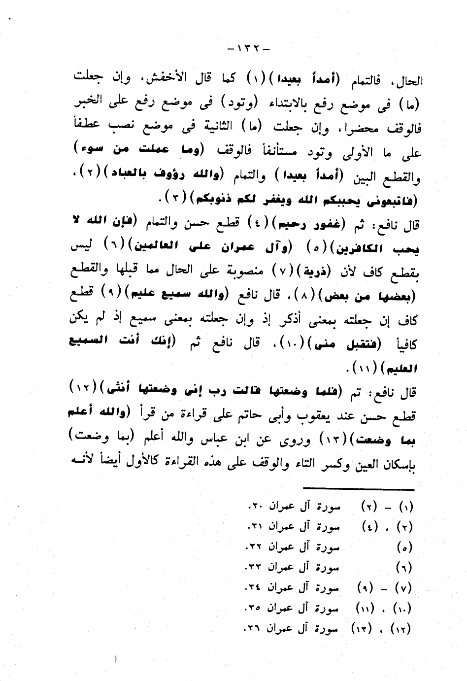 الحال، فالتمام {أمدًا بعيدًا} كما قال الأخفش، وإن جعلت (ما) في موضع رفع بالابتداء (وتود) في موضع رفع على الخبر فالوقف محضرا، وإن جعلت (ما) الثانية في موضع نصب عطفًا على ما الأولى وتود مستأنفًا فالوقف (وما عملت من سوء) والقطع البين (أمدًا بعيدًا) والتمام {والله رؤوف بالعباد}، {فاتبعوني يحببكم الله ويغفر لكم ذنوبكم}.