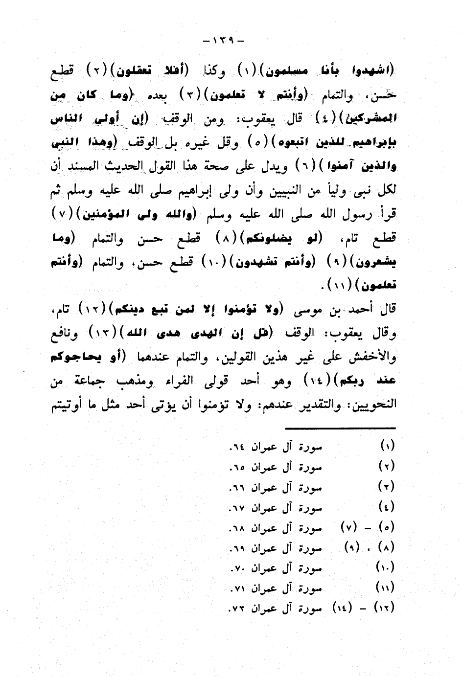 {اشهدوا بأنا مسلمون} وكذا {أفلا تعقلون} قطع حسن، والتمام {وأنتم لا تعلمون} بعده {وما كان من المشركين} قال يعقوب: ومن الوقف {إن أولى الناس بإبراهيم للذين اتبعوه} وقل غيره بل الوقف {وهذا النبي والذين آمنوا} ويدل على صحة هذا القول الحديث المسند أن لكل نبي وليًا من النبيين وأن ولي إبراهيم صلى الله عليه وسلم ثم قرأ رسول الله صلى الله عليه وسلم {والله ولي المؤمنين} قطع تام، {لو يضلونكم} قطع حسن والتمام {وما يشعرون} {وأنتم تشهدون} قطع حسن، والتمام {وأنتم تعلمون}.