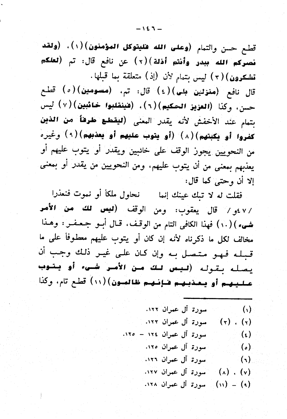 قطع حسن والتمام {وعلى الله فليتوكل المؤمنون}، {ولقد نصركم الله ببدر وأنتم أذلة} عن نافع قال: تم {لعلكم تشكرون} ليس بتمام لأن (إذ) متعلقة بما قبلها.