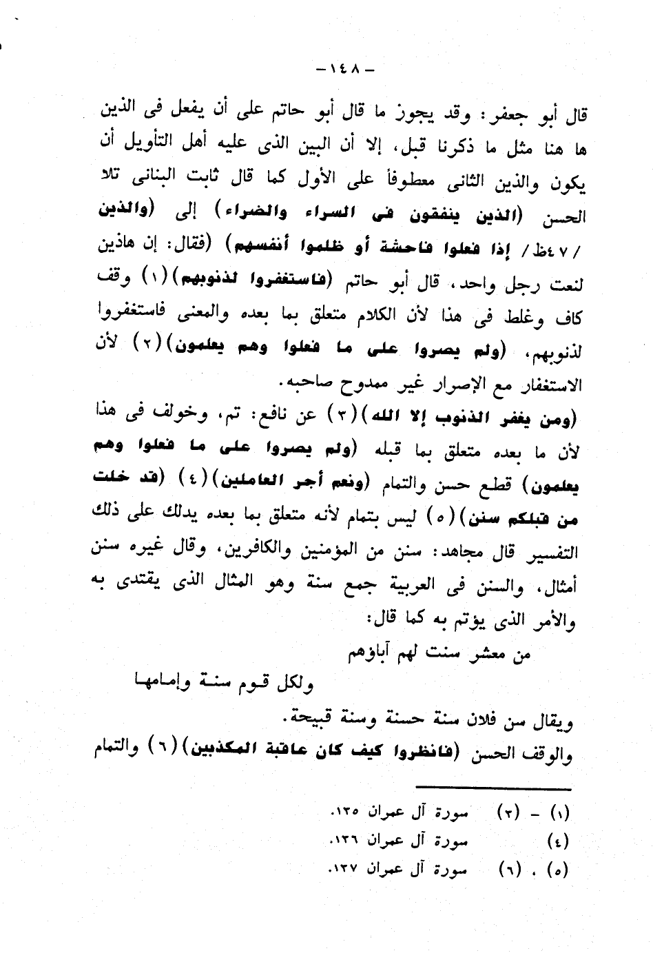 {ومن يغفر الذنوب إلا الله} عن نافع: تم، وخولف في هذا لأن ما بعده متعلق بما قبله (ولم يصروا على ما فعلوا وهم يعلمون) قطع حسن والتمام {ونعم أجر العاملين} {قد خلت من قبلكم سنن} ليس بتمام لأنه متعلق بما بعده يدلك على ذلك التفسير قال مجاهد: سنن من المؤمنين والكافرين، وقال غيره سنن أمثال، والسنن في العربية جمع سنة وهو المثال الذي يقتدي به والأمر الذي يؤتم به كما قال: