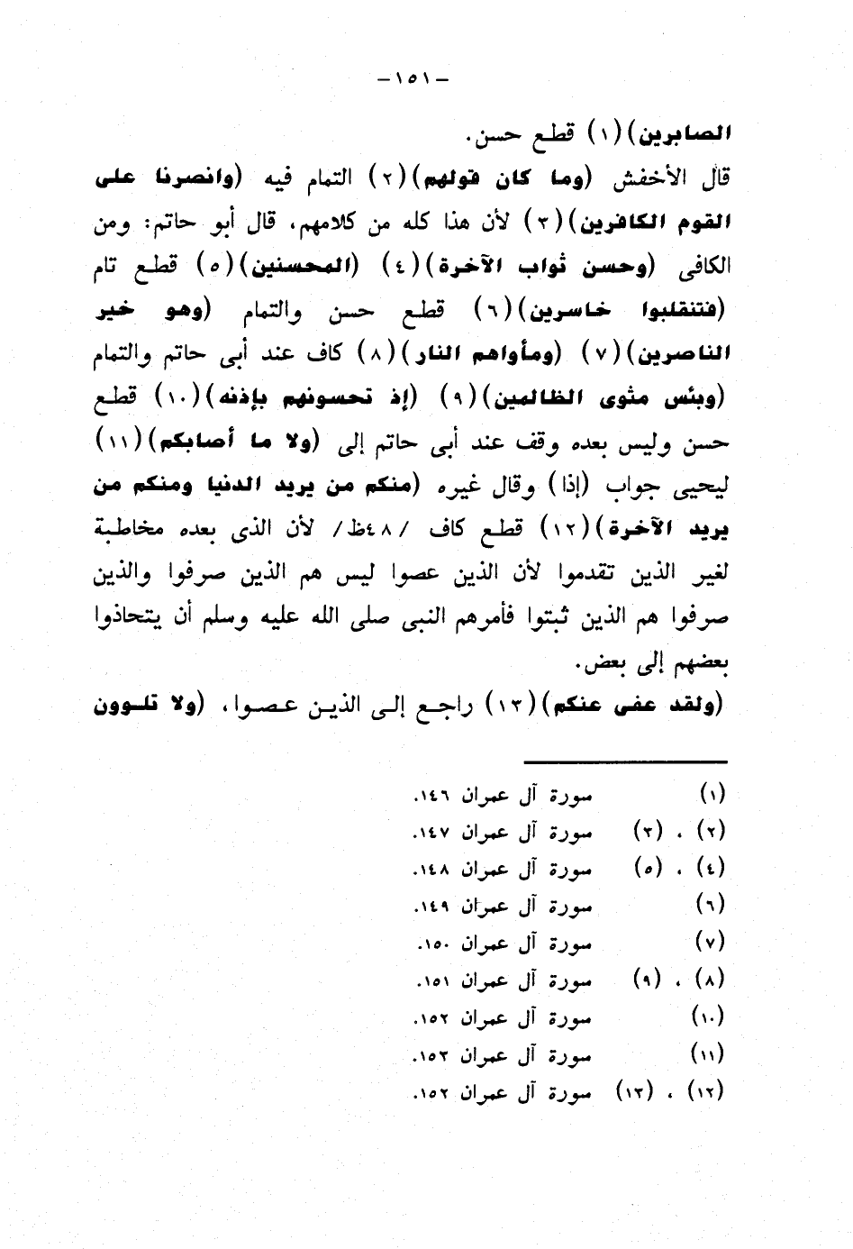 قال الأخفش {وما كان قولهم} التمام فيه {وانصرنا على القوم الكافرين} لأن هذا كله من كلامهم، قال أبو حاتم: ومن الكافي {وحسن ثواب الآخرة} {المحسنين} قطع تام {فتنقلبوا خاسرين} قطع حسن والتمام {وهو خير الناصرين} {ومأواهم النار} كاف عند أبي حاتم والتمام {وبئس مثوى الظالمين} {إذ تحسونهم بإذنه} قطع حسن وليس بعده وقف عند أبي حاتم إلى {ولا ما أصابكم} ليحيى جواب (إذا) وقال غيره {منكم من يريد الدنيا ومنكم من يريد الآخرة} قطع كاف لأن الذي بعده مخاطبة لغير الذين تقدموا لأن الذين عصوا ليس هم الذين صرفوا والذين صرفوا هم الذين ثبتوا فأمرهم النبي صلى الله عليه وسلم أن يتحاذوا بعضهم إلى بعض.
