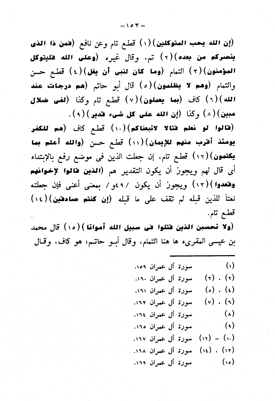 {إن الله يحب المتوكلين} قطع تام وعن نافع {فمن ذا الذي ينصركم من بعده} تم، وقال غيره {وعلى الله فليتوكل المؤمنون} التمام {وما كان لنبي أن يغل} قطع حسن والتمام {وهم لا يظلمون} قال أبو حاتم {هم درجات عند الله} كاف {بما يعملون} قطع تام وكذا {لفي ضلال مبين} وكذا {إن الله على كل شيء قدير}.