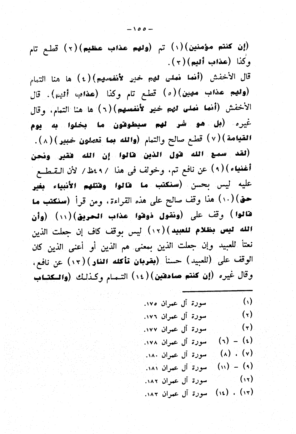 قال الأخفش {أنما نملي لهم خير لأنفسهم} هاهنا التمام {ولهم عذاب مهين} قطع تام وكذا (عذاب اليم). قال الأخفش {أنما نملي لهم خير لأنفسهم} هاهنا التمام، وقال غيره {بل هو شر لهم سيطوقون ما بخلوا به يوم القيامة} قطع صالح والتمام {والله بما تعملون خبير}. {لقد سمع الله قول الذين قالوا إن الله فقير ونحن أغنياء} عن نافع تم، وخولف في هذا لأن القطع عليه ليس بحسن {سنكتب ما قالوا وقتلهم الأنبياء بغير حق} هذا وقف صالح على هذه القراءة، ومن قرأ (سنكتب ما قالوا) وقف على {ونقول ذوقوا عذاب الحريق} {وأن الله ليس بظلام للعبيد} ليس بوقف كاف إن جعلت الذين نعتًا للعبيد وإن جعلت الذين بمعنى هم الذين أو أعني الذين كان الوقف على (للعبيد) حسنًا {بقربان تأكله النار} عن نافع، وقال غيره {إن كنتم صادقين} التمام وكذلك {والكتاب