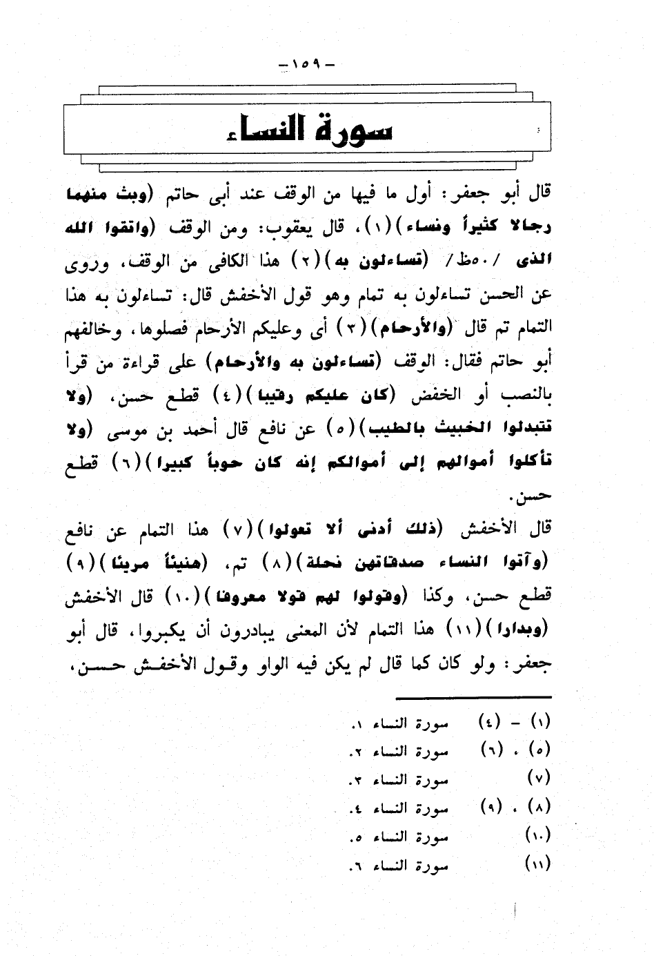 قال أبو جعفر: أول ما فيها من الوقف عند أبي حاتم {وبث منهما رجالا كثيرًا ونساء}، قال يعقوب: ومن الوقف {واتقوا الله الذي تساءلون به} هذا الكافي من الوقف، وروى عن الحسن تساءلون به تمام وهو قول الأخفش قال: تساءلون به هذا التمام تم قال {والأرحام} أي وعليكم الأرحام فصلوها، وخالفهم أبو حاتم فقال: الوقف (تساءلون به والأرحام) على قراءة من قرأ بالنصب أو الخفض {كان عليكم رقيقا} قطع حسن، {ولا تتبدلوا الخبيث بالطيب} عن نافع قال أحمد بن موسى {ولا تأكلوا أموالهم إلى أموالكم إنه كان حوبًا كبيرا} قطع حسن.
