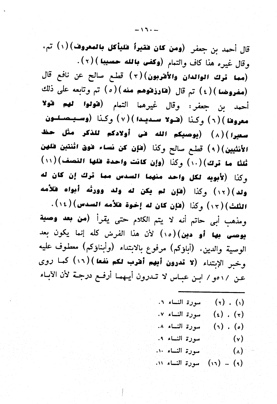 {مما ترك الوالدان والأقربون} قطع صالح عن نافع قال {مفروضا} تم قال {فارزقوهم منه} تم وتابعه على ذلك أحمد بن جعفر: وقال غيرهما التمام {قولوا لهم قولا معروفا} وكذا {قولا سديدا} وكذا {وسيصلون سعيرا} {يوصيكم الله في أولادكم للذكر مثل حظ الأنثيين} قطع صالح وكذا {فإن كن نساء فوق اثنتين فلهن ثلثا ما ترك} وكذا {وإن كانت واحدة فلها النصف} وكذا {لأبويه لكل واحد منهما السدس مما ترك إن كان له ولد} وكذا {فإن لم يكن له ولد وورثه أبواه فلأمه الثلث} وكذا {فإن كان له إخوة فلأمه السدس}.