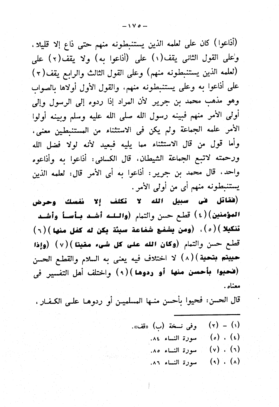 {فقاتل في سبيل الله لا تكلف إلا نفسك وحرض المؤمنين} قطع حسن والتمام {والله أشد بأسًا وأشد تنكيلا}، {ومن يشفع شفاعة سيئة يكن له كفل منها} قطع حسن والتمام {وكان الله على كل شيء مقيتا} {وإذا حييتم بتحية} لا اختلاف فيه يعني به السلام والقطع الحسن {فحيوا بأحسن منها أو ردوها} واختلف أهل التفسير في معناه.