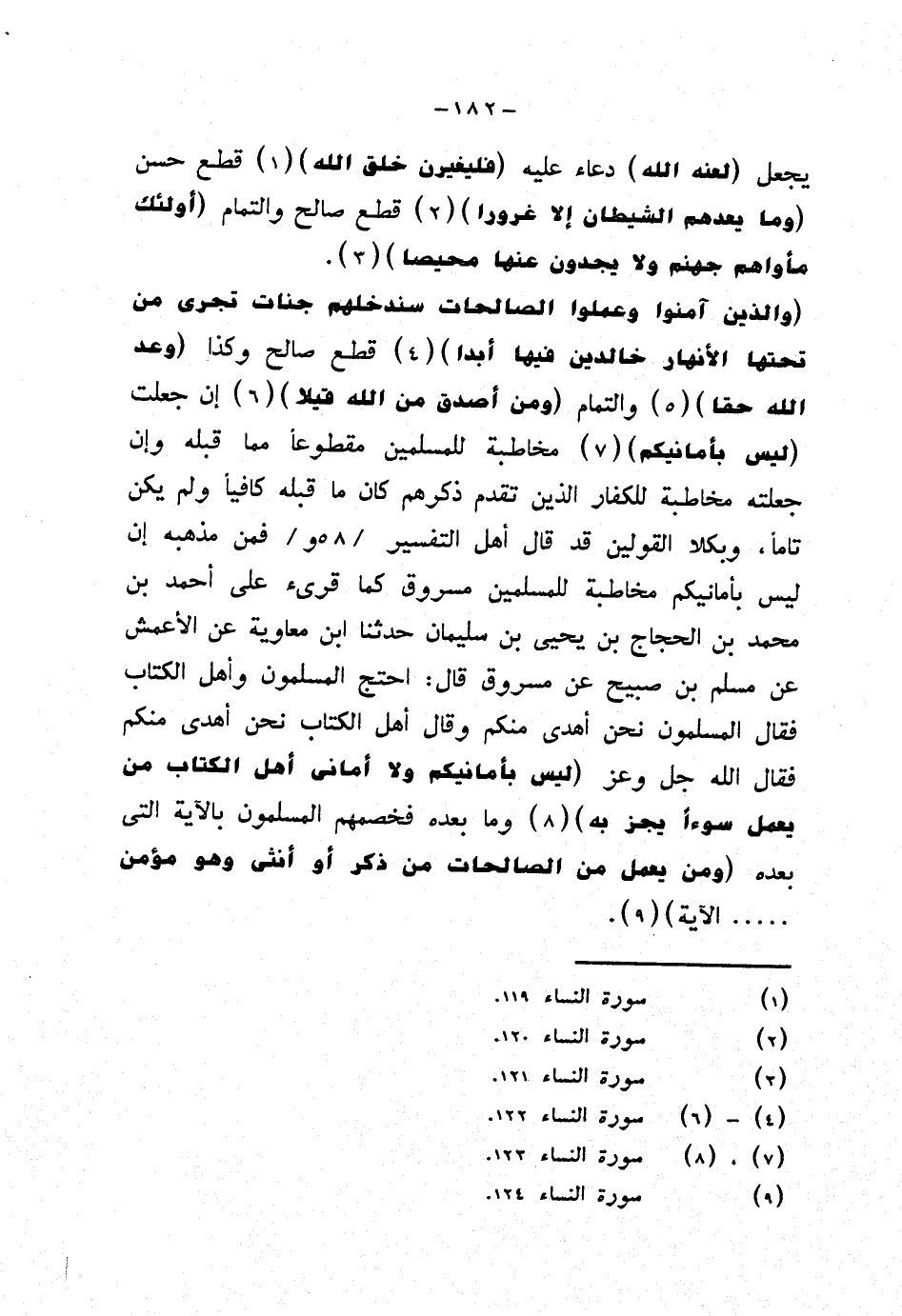 {والذين آمنوا وعملوا الصالحات سندخلهم جنات تجري من تحتها الأنهار خالدين فيها أبدا} قطع صالح وكذا {وعد الله حقا} والتمام {ومن أصدق من الله قيلا} إن جعلت {ليس بأمانيكم} مخاطبة للمسلمين مقطوعًا مما قبله وإن جعلته مخاطبة للكفار الذين تقدم ذكرهم كان ما قبله كافيًا ولم يكن تامًا، وبكلا القولين قد قال أهل التفسير فمن مذهبه إن ليس بأمانيكم مخاطبة للمسلمين مسروق كما قرئ على أحمد بن محمد بن الحجاج بن يحيى بن سليمان حدثنا ابن معاوية عن الأعمش عن مسلم بن صبيح عن مسروق قال: احتج المسلمون وأهل الكتاب فقال المسلمون نحن أهدى منكم وقال أهل الكتاب نحن أهدى منكم فقال الله جل وعز {ليس بأمانيكم ولا أماني أهل الكتاب من يعمل سوءًا يجز به} وما بعده فخمهم المسلمون بالآية التي بعده {ومن يعمل من الصالحات من ذكر أو أنثى وهو مؤمن ... الآية}.