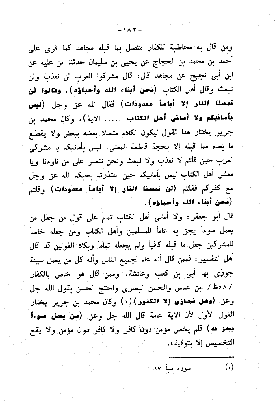 قال أبو جعفر: ولا أماني أهل الكتاب تمام على قول من جعل من يعمل سوءا يجز به عامًا للمسلمين وأهل الكتاب ومن جعله خاصًا للمشركين جعل ما قبله كافيًا ولم يجعله تمامًا وبكلا القولين قد قال أهل التفسير: فممن قال أنه عام لجميع الناس وأنه كل من يعمل سيئة جوزي بها أبي بن كعب وعائشة، وممن قال هو خاص بالكفار ابن عباس والحسن البصري واحتج الحسن بقول الله جل وعز {وهل نجازي إلا الكفور} وكان محمد بن جرير يختار القول الأول لأن الآية عامة قال الله جل وعز (من يعمل سوءا يجز به) فلم يخص مؤمن دون كافر ولا كافر دون مؤمن ولا يقع التخصيص إلا بتوقيف.