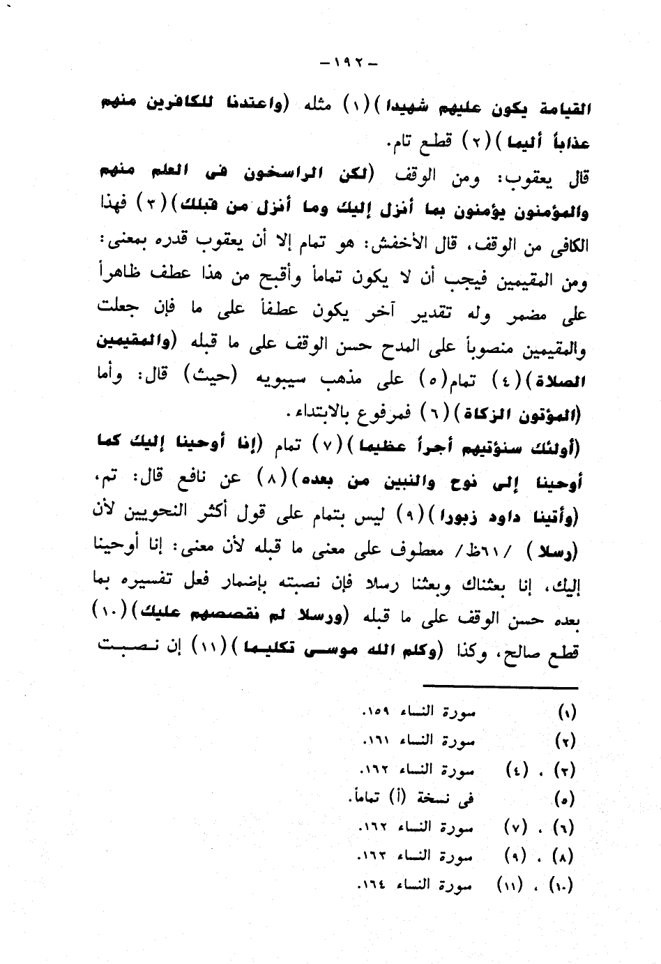 قال يعقوب: ومن الوقف {لكن الراسخون في العلم منهم والمؤمنون يؤمنون بما أنزل إليك وما أنزل من قبلك} فهذا الكافي من الوقف، قال الأخفش: هو تمام إلا أن يعقوب قدره بمعنى: ومن المقيمين فيجب أن لا يكون تمامًا وأقبح من هذا عطف ظاهرًا على مضمر وله تقدير آخر يكون عطفًا على ما فإن جعلت والمقيمين منصوبًا على المدح حسن الوقف على ما قبله {والمقيمين الصلاة} تمام على مذهب سيبويه (حيث) قال: وأما {المؤتون الزكاة} فمرفوع بالابتداء.