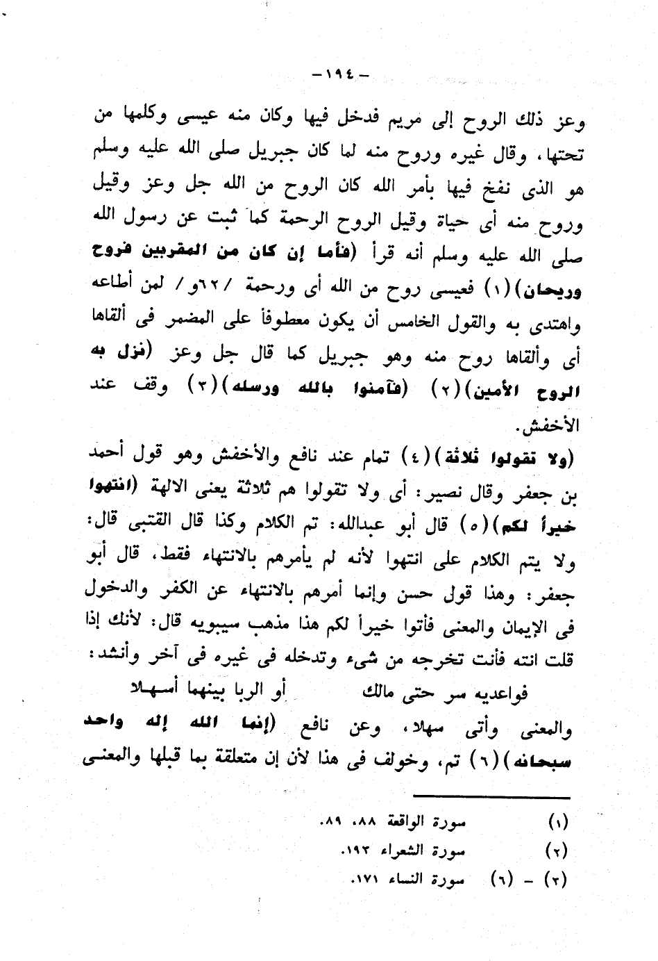 {ولا تقولوا ثلاثة} تمام عند نافع والأخفش وهو قول أحمد بن جعفر وقال نصير: أي ولا تقولوا هم ثلاثة يعني الإلهة {انتهوا خيرًا لكم} قال أبو عبد الله: تم الكلام وكذا قال القتبي قال: ولا يتم الكلام على انتهوا لأنه لم يأمرهم بالانتهاء فقط، قال أبو جعفر: وهذا قول حسن وإنما أمرهم بالانتهاء عن الكفر والدخول في الإيمان والمعنى فأتوا خيرًا لكم هذا مذهب سيبويه قال: لأنك إذا قلت انته فأنت تخرجه من شيء وتدخله في غيره في آخر وأنشد: