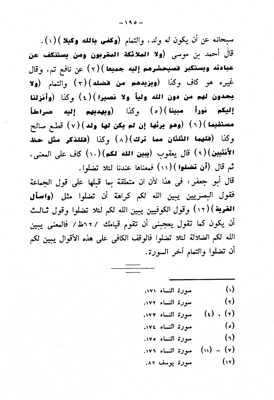 قال أحمد بن موسى {ولا الملائكة المقربون ومن يستنكف عن عبادته ويستكبر فسيحشرهم إليه جميعا} عن نافع تم، وقال غيره هو كاف وكذا {ويزيدهم من فضله} والتمام {ولا يجدون لهم من دون الله وليًا ولا نصيرا} وكذا {وأنزلنا إليكم نورا مبينا} وكذا {ويهديهم إليه صراطا مستقيما} {وهو يرثها إن لم يكن لها ولد} قطع صالح وكذا {فلهما الثلثان مما ترك} وكذا {فللذكر مثل حظ الأنثيين} قال يعقوب {يبين الله لكم} كاف على المعنى، ثم قال {أن تضلوا} فمعناها عندنا لئلا تضلوا.