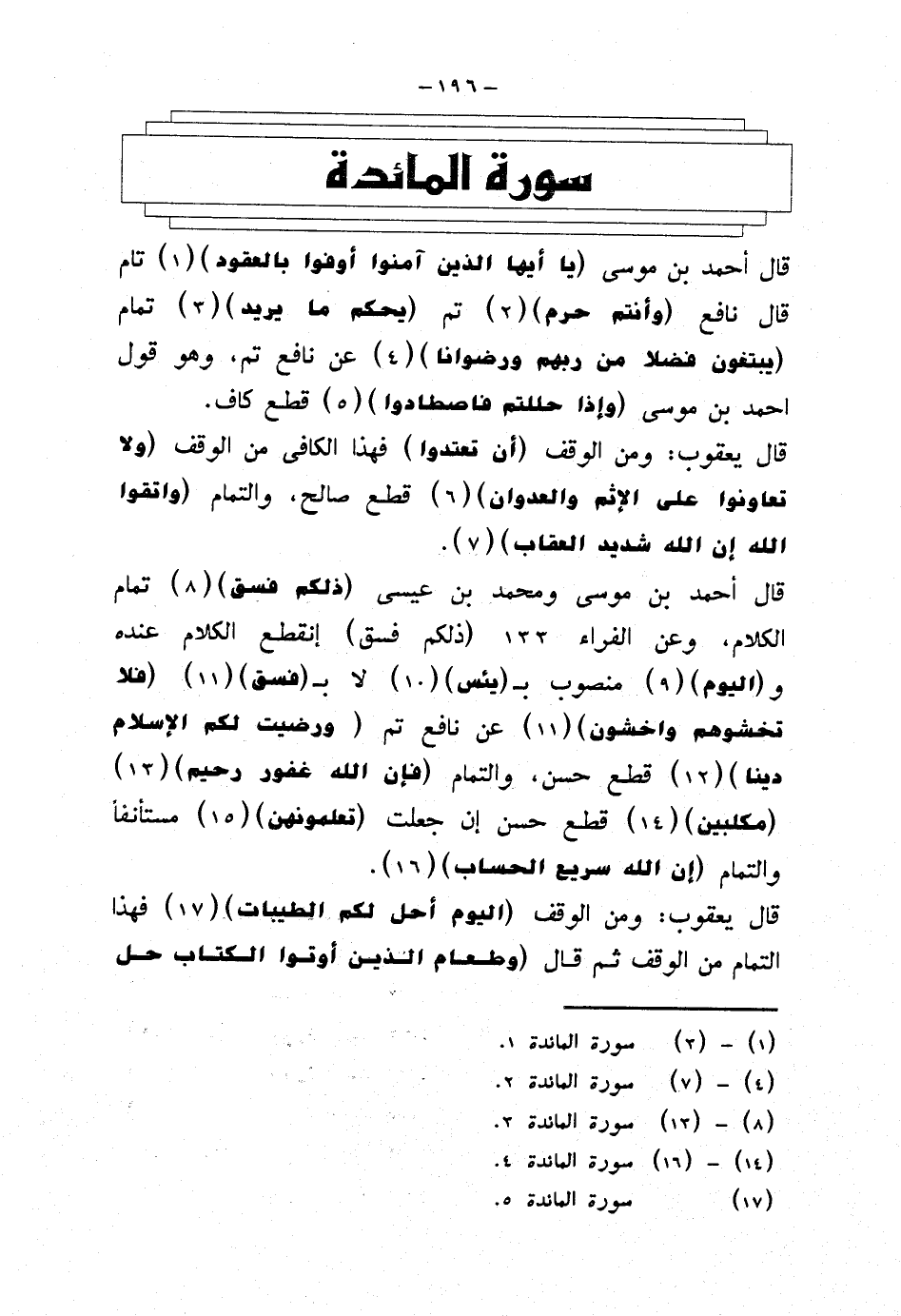 قال أحمد بن موسى {يا أيها الذين آمنوا أوفوا بالعقود} تام قال نافع {وأنتم حرم} تم {يحكم ما يريد} تمام {يبتغون فضلا من ربهم ورضوانا} عن نافع تم، وهو قول أحمد بن موسى {وإذا حللتم فاصطادوا} قطع كاف.