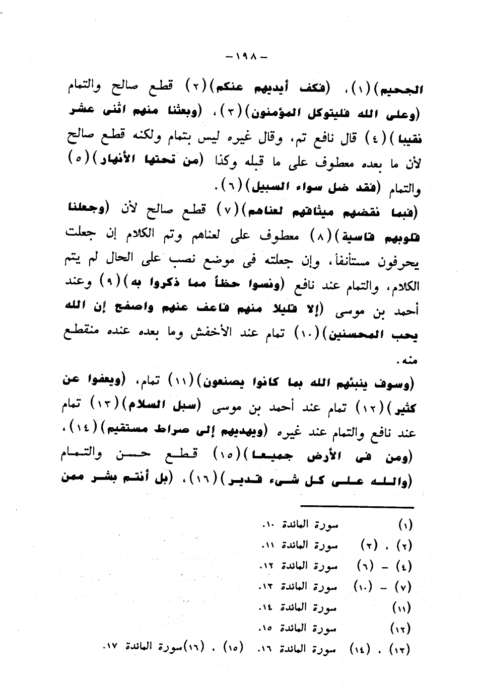 {فبما نقضهم ميثاقهم لعناهم} قطع صالح لأن {وجعلنا قلوبهم قاسية} معطوف على لعناهم وتم الكلام إن جعلت يحرفون مستأنفًا، وإن جعلته في موضع نصب على الحال لم يتم الكلام، والتمام عند نافع {ونسوا حظا مما ذكروا به} وعند أحمد بن موسى {إلا قليلا منهم فاعف عنهم واصفح إن الله يحب المحسنين} تمام عند الأخفش وما بعده عنده منقطع منه.