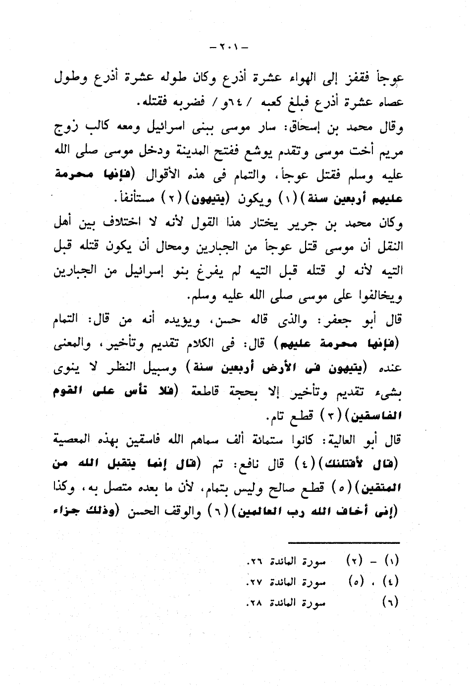 وقال محمد بن إسحاق: سار موسى ببني إسرائيل ومعه كالب زوج مريم أخت موسى وتقدم يوشع ففتح المدينة ودخل موسى صلى الله عليه وسلم فقتل عوجا، والتمام في هذه الأقوال {فإنها محرمة عليهم أربعين سنة} ويكون {يتيهون} مستأنفًا.