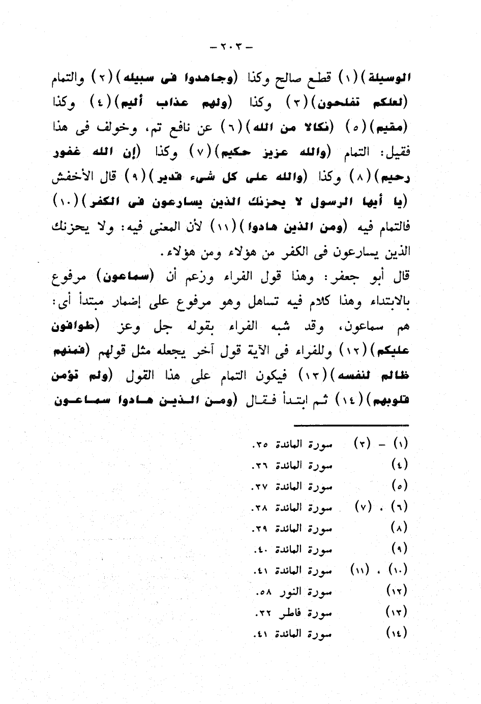 الوسيلة} قطع صالح وكذا {وجاهدوا في سبيله} والتمام {لعلكم تفلحون} وكذا {ولهم عذاب أليم} وكذا {مقيم} {نكالا من الله} عن نافع تم، وخولف في هذا فقيل: التمام {والله عزيز حكيم} وكذا {إن الله غفور رحيم} وكذا {والله على كل شيء قدير} قال الأخفش {يا أيها الرسول لا يحزنك الذين يسارعون في الكفر} فالتمام فيه {ومن الذين هادوا} لأن المعنى فيه: ولا يحزنك الذين يسارعون في الكفر من هؤلاء ومن هؤلاء.