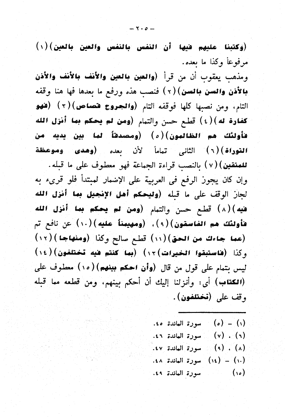 ومذهب يعقوب أن من قرأ {والعين بالعين والأنف بالأنف والأذن بالأذن والسن بالسن} فنصب هذه ورفع ما بعدها فهاهنا وقفه التام، ومن نصبها كلها فوقفه التام {والجروح قصاص} {فهو كفارة له} قطع حسن والتمام {ومن لم يحكم بما أنزل الله فأولئك هم الظالمون} {ومصدقا لما بين يديه من التوراة} الثاني تمامًا لأن بعده {وهدى وموعظة للمتقين} بالنصب قراءة الجماعة فهو معطوف على ما قبله.