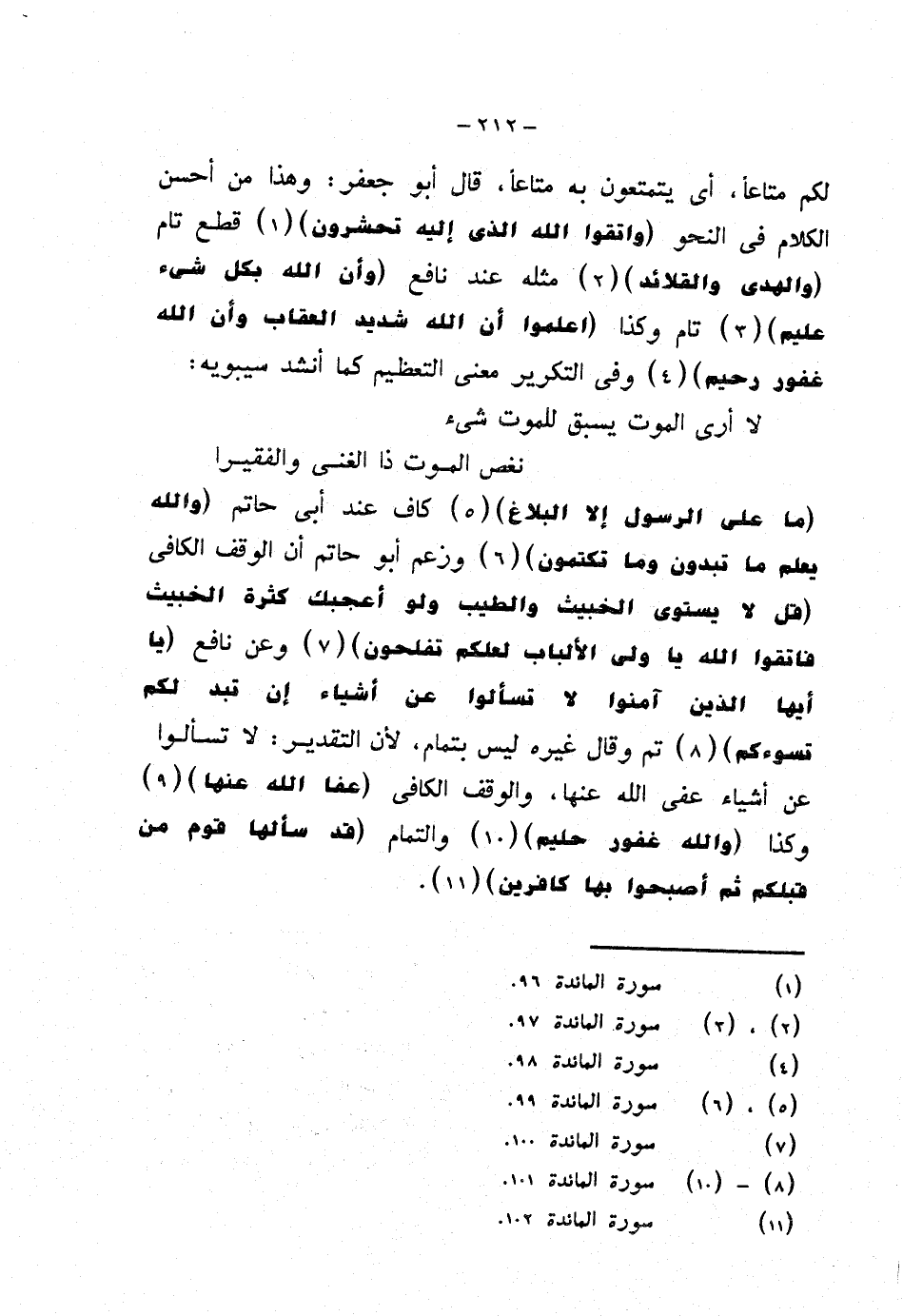 لكم متاعًا، أي يتمتعون به متاعًا، قال أبو جعفر: وهذا من أحسن الكلام في النحو {واتقوا الله الذي إليه تحشرون} قطع تام {والهدى والقلائد} مثله عند نافع {وأن الله بكل شيء عليم} تام وكذا {اعلموا أن الله شديد العقاب وأن الله غفور رحيم} وفي التكرير معنى التعظيم كما أنشد سيبويه: