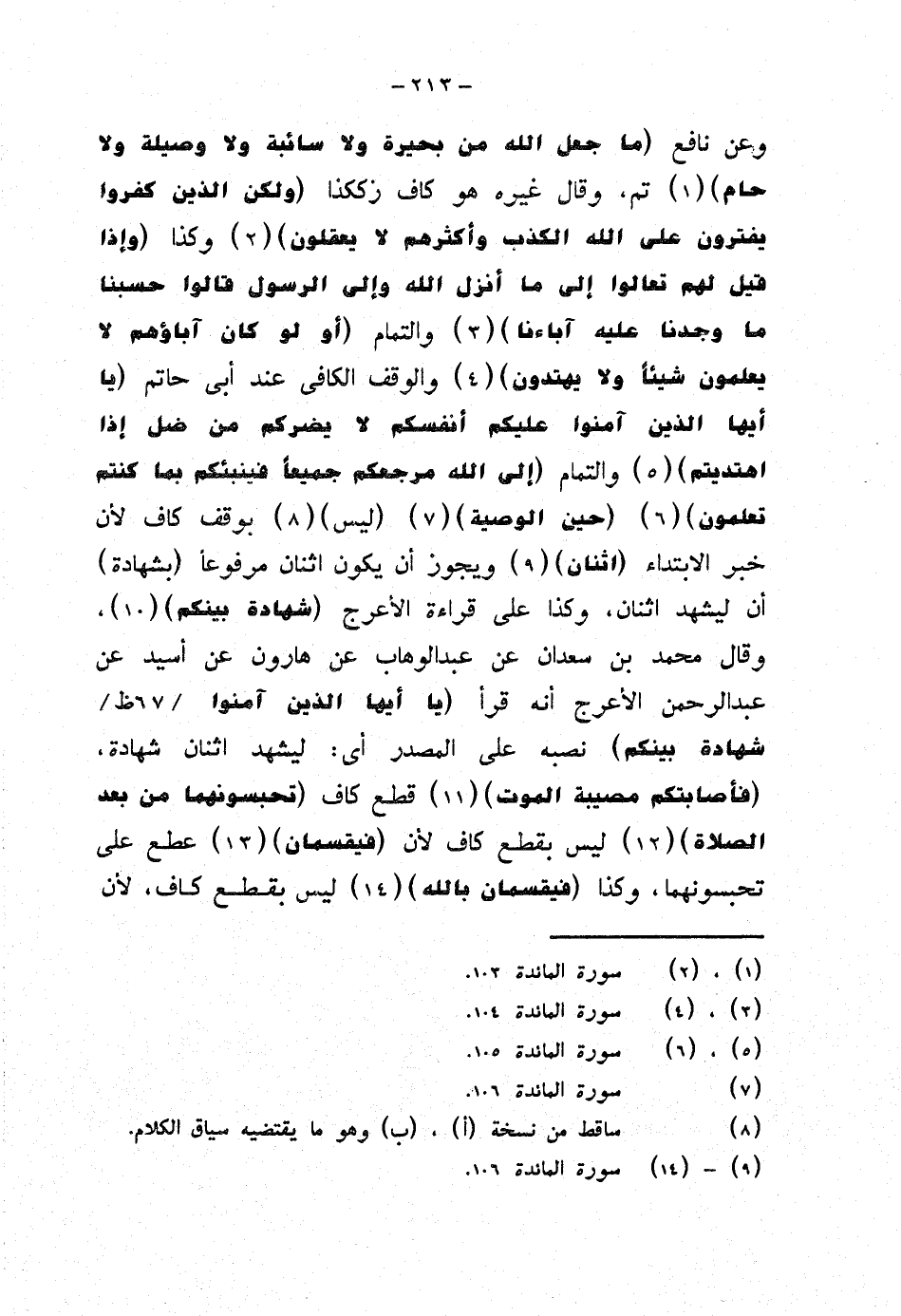 وعن نافع {ما جعل الله من بحيرة ولا سائبة ولا وصيلة ولا حام} تم، وقال غيره هو كاف وكذا {ولكن الذين كفروا يفترون على الله الكذب وأكثرهم لا يعقلون} وكذا {وإذا قيل لهم تعالوا إلى ما أنزل الله وإلى الرسول قالوا حسبنا ما وجدنا عليه آباءنا} والتمام {أو لو كان آباؤهم لا يعلمون شيئًا ولا يهتدون} والوقف الكافي عند أبي حاتم {يا أيها الذين آمنوا عليكم أنفسكم لا يضركم من ضل إذا اهتديتم} والتمام {إلى الله مرجعكم جميعا فينبئكم بما كنتم تعلمون} {حين الوصية} (ليس) بوقف كاف لأن خبر الابتداء {اثنان} ويجوز أن يكون اثنان مرفوعًا (بشهادة) أن ليشهد اثنان، وكذا على قراءة الأعرج {شهادة بينكم}، وقال محمد بن سعدان عن عبد الوهاب عن هارون عن أسيد عن عبد الرحمن الأعرج أنه قرأ (يا أيها الذين آمنوا شهادة بينكم) نصبه على المصدر أي: ليشهد اثنان شهادة، {فأصابتكم مصيبة الموت} قطع كاف {تحسبونهما من بعد الصلاة} ليس بقطع كاف لأن {فيقسمان} عطف على تحبسونهما، وكذا {فيقسمان بالله} ليس بقطع كاف، لأن