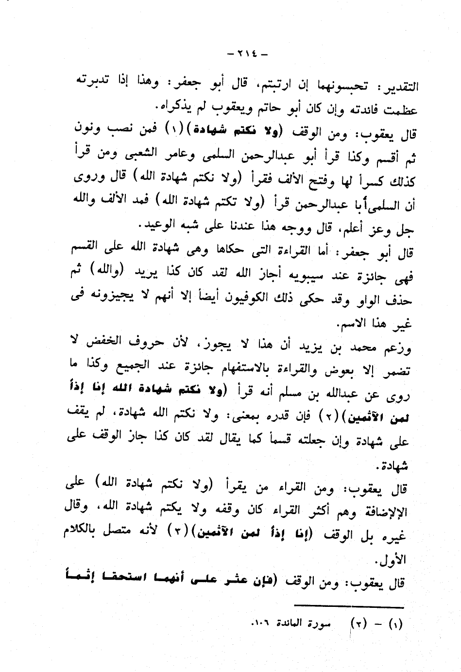 قال يعقوب: ومن القراء من يقرأ (ولا نكتم شهادة الله) على الإضافة وهم أكثر القراء كان وقفه ولا يكتم شهادة الله، وقال غيره بل الوقف {إنا إذًا لمن الآثمين} لأنه متصل بالكلام الأول.