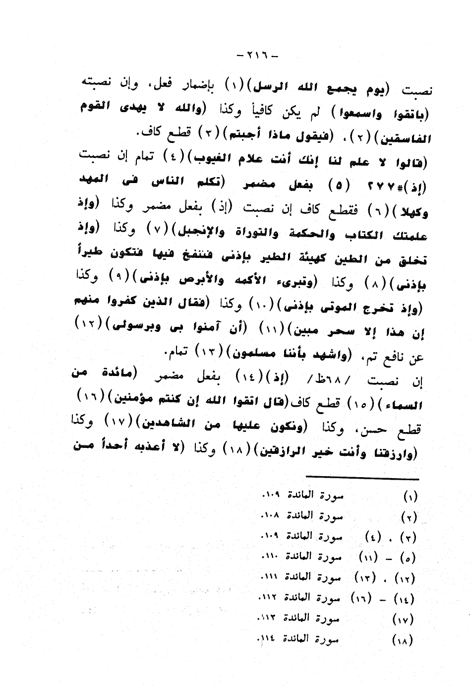 {قالوا لا علم لنا إنك أنت علام الغيوب} تمام إن نصبت (إذ) بفعل مضمر {تكلم الناس في المهد وكهلا} فقطع كاف إن نصبت (إذ) بفعل مضمر وكذا {وإذ علمتك الكتاب والحكمة والتوراة والإنجيل} وكذا {وإذ تخلق من الطين كهيئة الطير بإذني فتنفخ فيها فتكون طيرا بإذني} وكذا {وتبرئ الأكمه والأبرص بإذني} وكذا {وإذ تخرج الموتى بإذني} وكذا {فقال الذين كفروا منهم إن هذا إلا سحر مبين} {أن آمنوا بي وبرسول} عن نافع تم، {واشهد بأننا مسلمون} تمام.
