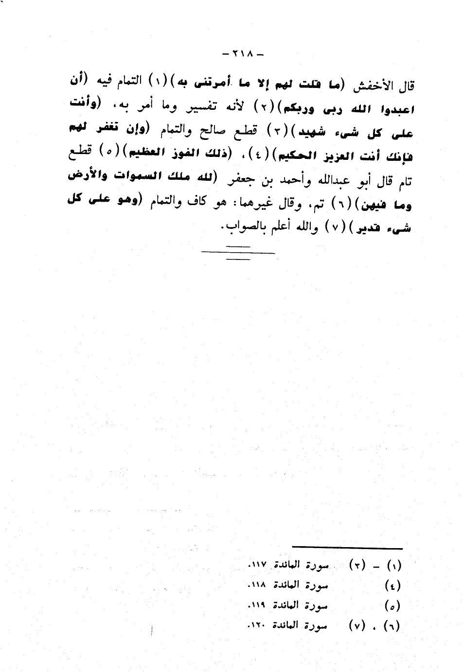 قال الأخفش {ما قلت لهم إلا ما أمرتني به} التمام فيه {أن اعبدوا الله ربي وربكم} لأنه تفسير وما أمر به، {وأنت على كل شيء شهيد} قطع صالح والتمام {وإن تغفر لهم فإنك أنت العزيز الحكيم}، {ذلك الفوز العظيم} قطع تام قال أبو عبد الله وأحمد بن جعفر {لله ملك السموات والأرض وما فيهن} تم، وقال غيرهما: هو كاف والتمام {وهو على كل شيء قدير} والله أعلم بالصواب.