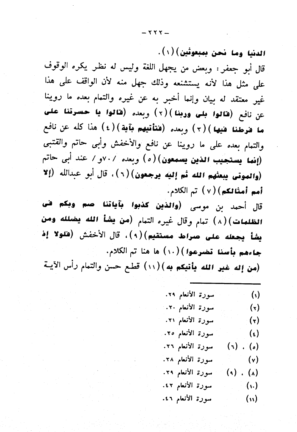 قال أحمد بن موسى {والذين كذبوا بآياتنا صم وبكم في الظلمات} تمام وقال غيره التمام {من يشأ الله يضلله ومن يشأ يجعله على صراط مستقيم}، قال الأخفش {فلولا إذ جاءهم بأسنا تضرعوا} هاهنا تم الكلام.