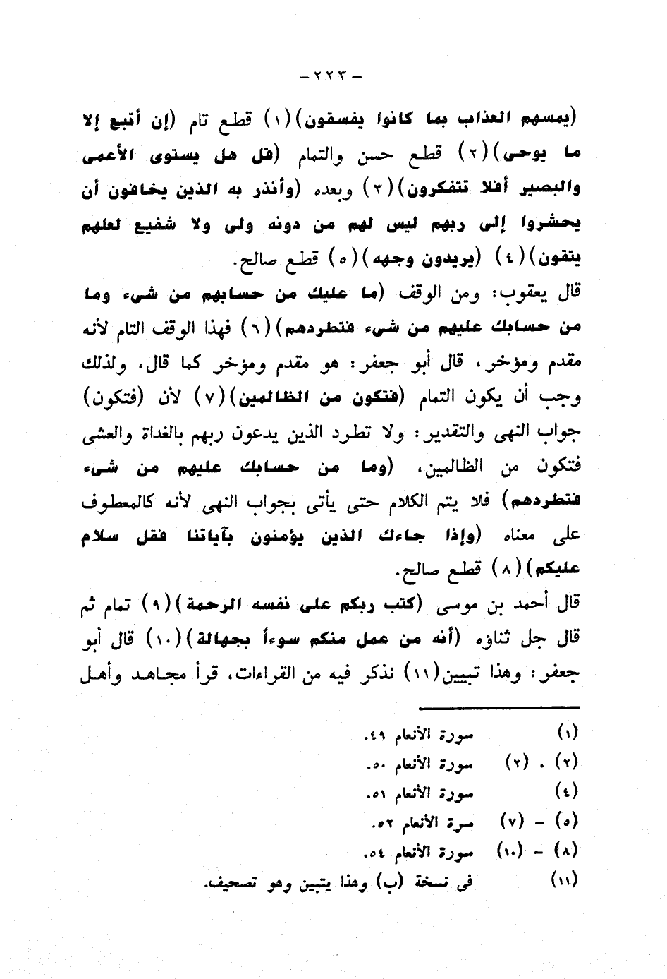 قال يعقوب: ومن الوقف {ما عليك من حسابهم من شيء وما من حسابك عليهم من شيء فتطردهم} فهذا الوقف التام لأنه مقدم ومؤخر، قال أبو جعفر: هو مقدم ومؤخر كما قال، ولذلك وجب أن يكون التمام {فتكون من الظالمين} لأن (فتكون) جواب النهي والتقدير: ولا تطرد الذين يدعون ربهم بالغداة والعشي فتكون من الظالمين، {وما من حسابك عليهم من شيء فتطردهم} فلا يتم الكلام حتى يأتي بجواب النهي لأنه كالمعطوف على معناه {وإذا جاءك الذين يؤمنون بآياتنا فقل سلام عليكم} قطع صالح.
