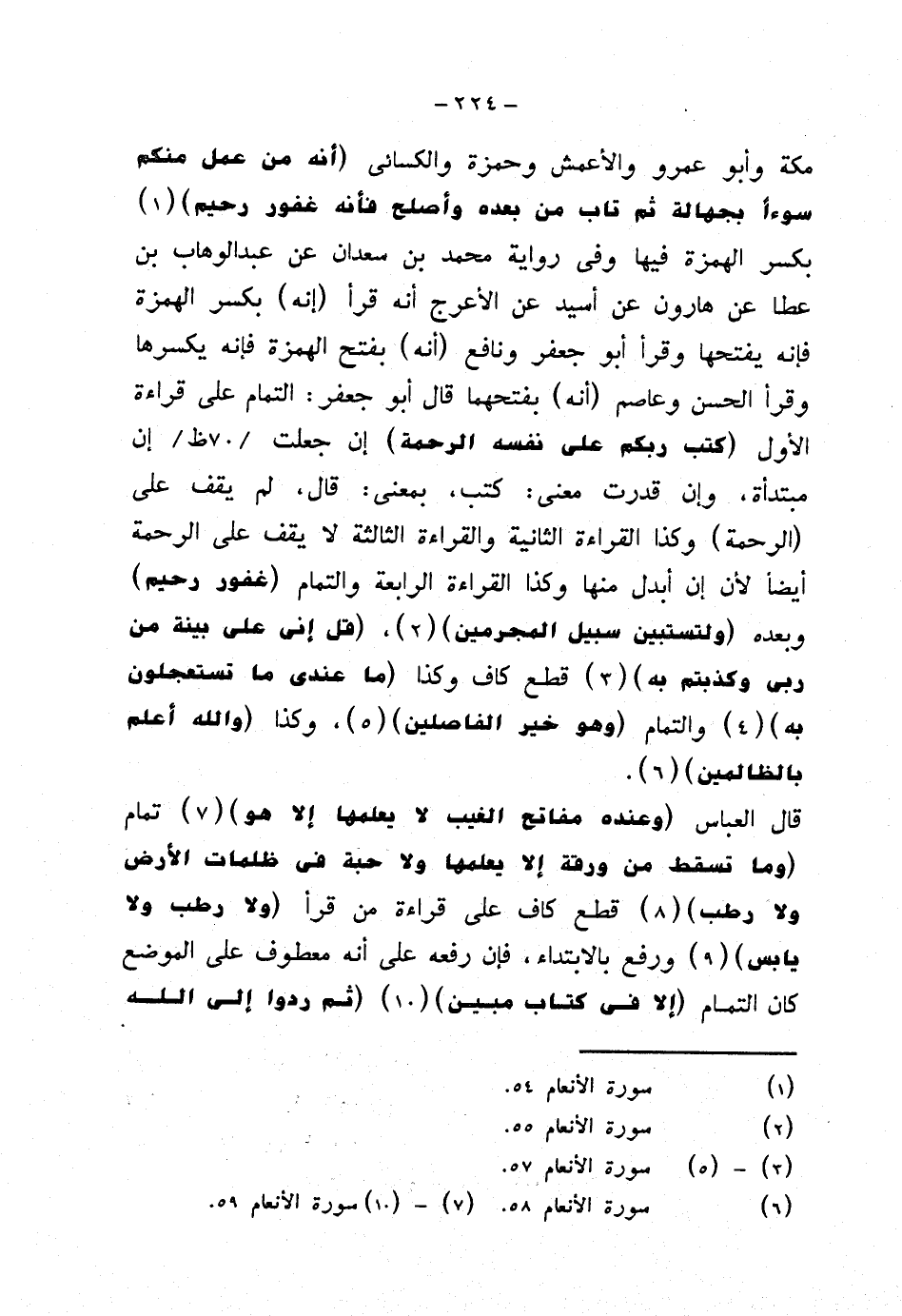 مكة وأبو عمرو والأعمش وحمزة والكسائي {أنه من عمل منكم سوءًا بجهالة ثم تاب من بعده وأصلح فأنه غفور رحيم} بكسر الهمزة فيها وفي رواية محمد بن سعدان عن عبد الوهاب بن عطا عن هارون عن أسيد عن الأعرج أنه قرأ (إنه) بكسر الهمزة فإنه يفتحها وقرأ أبو جعفر ونافع (أنه) بفتح الهمزة فإنه يكسرها وقرأ الحسن وعاصم (أنه) بفتحهما قال أبو جعفر: التمام على قراءة الأول (كتب ربكم على نفسه الرحمة) إن جعلت إن مبتدأة، وإن قدرت معنى: كتب، بمعنى: قال، لم يقف على (الرحمة) وكذا القراءة الثانية والقراءة الثالثة لا يقف على الرحمة أيضًا لأن إن أبدل منها وكذا القراءة الرابعة والتمام {غفور رحيم} وبعده {ولتستبين سبيل المجرمين}، {قل إني على بينة من ربي وكذبتم به} قطع كاف وكذا {ما عندي ما تستعجلون به} والتمام {وهو خير الفاصلين}، وكذا {والله أعلم بالظالمين}.