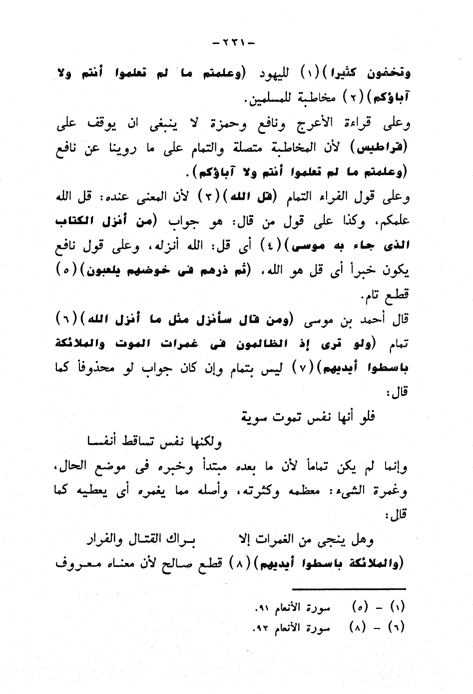 وعلى قراءة الأعرج ونافع وحمزة لا ينبغي أن يوقف على (قراطيس) لأن المخاطبة متصلة والتمام على ما روينا عن نافع (وعلمتم ما لم تعلموا أنتم ولا آباؤكم).