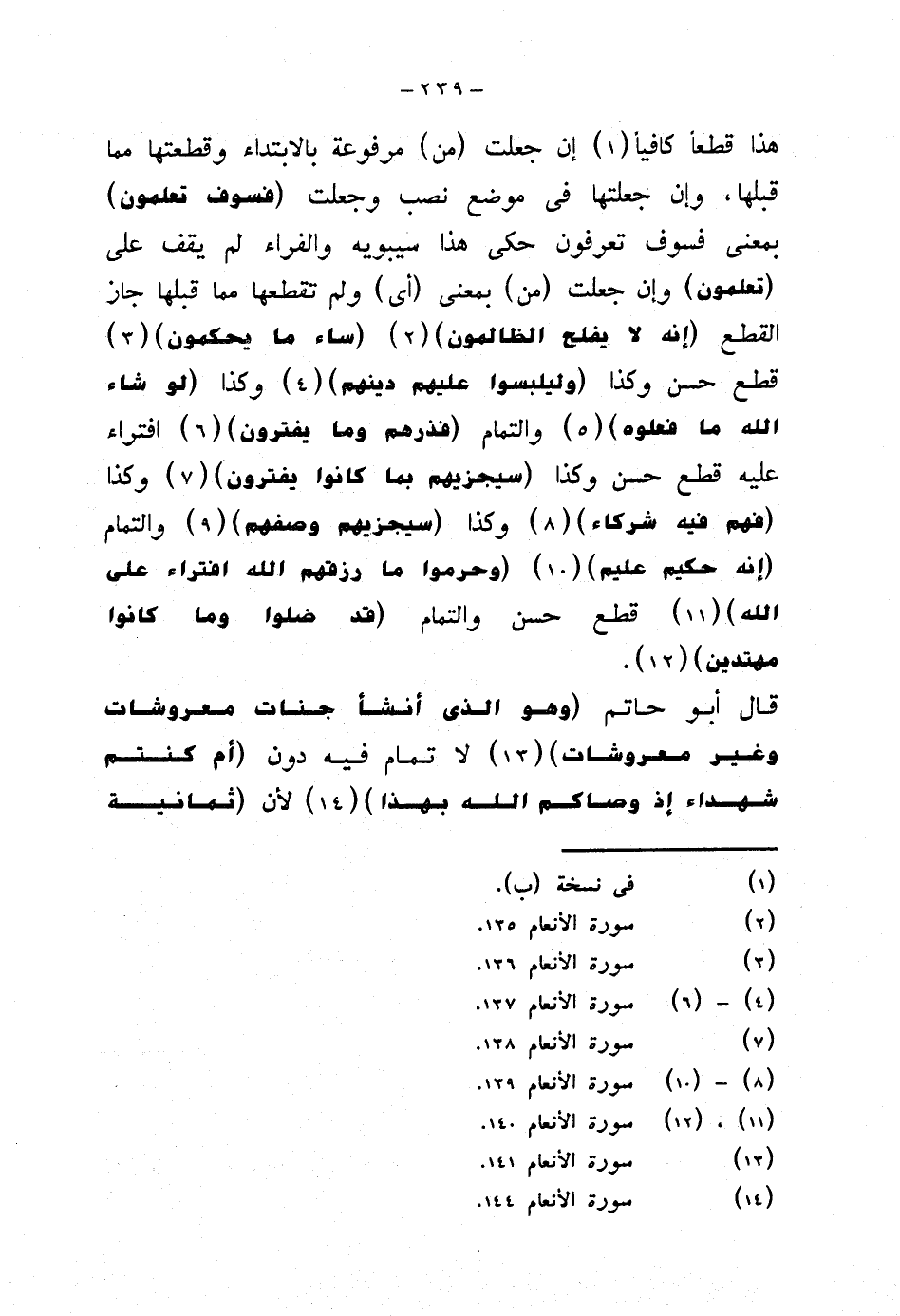 هذا قطعًا كافيًا إن جعلت (من) مرفوعة بالابتداء وقطعتها مما قبلها، وإن جعلتها في موضع نصب وجعلت (فسوف تعلمون) بمعنى فسوف تعرفون حكى هذا سيبويه والفراء لم يقف على (تعلمون) وإن جعلت (من) بمعنى (أي) ولم تقطعها مما قبلها جاز القطع {إنه لا يفلح الظالمون} {ساء ما يحكمون} قطع حسن وكذا {وليلبسوا عليهم دينهم} وكذا {لو شاء الله ما فعلوه} والتمام {فذرهم وما يفترون} افتراء عليه قطع حسن وكذا {سيجزيهم بما كانوا يفترون} افتراء عليه قطع حسن وكذا {سيجزيهم بما كانوا يفترون} وكذا {فهم فيه شركاء} وكذا {سيجزيهم وصفهم} والتمام {إنه حكيم عليم} {وحرموا ما رزقهم الله افتراء على الله} قطع حسن والتمام {قد ضلوا وما كانوا مهتدين}.