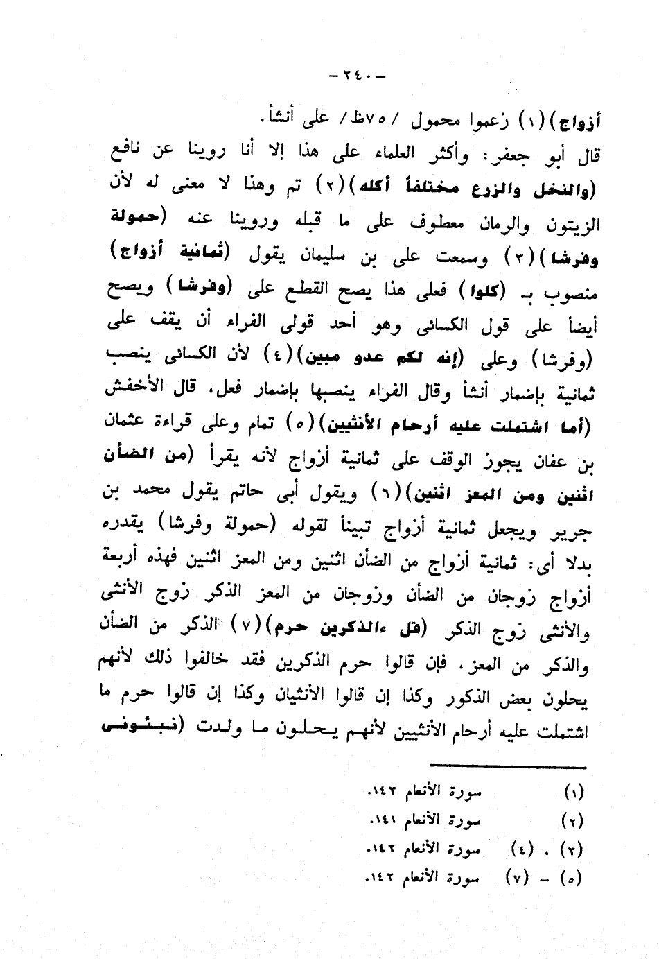 قال أبو جعفر: وأكثر العلماء على هذا إلا أنا روينا عن نافع {والنخل والزرع مختلفًا أكله} تم وهذا لا معنى له لأن الزيتون والرمان معطوف على ما قبله وروينا عنه {حمولة وفرشا} وسمعت علي بن سليمان يقول (ثمانية أزواج) منصوب بـ (كلوا) فعلى هذا يصح القطع على (وفرشا) ويصح أيضًا على قول الكسائي وهو أحد قولي الفراء أن يقف على (وفرشا) وعلى {إنه لكم عدو مبين} لأن الكسائي ينصب ثمانية بإضمار أنشأ وقال الفراء ينصبها بإضمار فعل، قال الأخفش {أما اشتملت عليه أرحام الأنثيين} تمام وعلى قراءة عثمان بن عفان يجوز الوقف على ثمانية أزواج لأنه يقرأ {من الضأن اثنين ومن المعز اثنين} ويقول أبي حاتم يقول محمد بن جرير ويجعل ثمانية أزواج تبينًا لقوله (حمولة وفرشا) يقدره بدلا أي: ثمانية أزواج من الضأن اثنين ومن المعز اثنين فهذه أربعة أزواج زوجان من الضأن وزوجان من المعز الذكر زوج الأنثى والأنثى زوج الذكر {قل ءالذكرين حرم} الذكر من الضأن والذكر من المعز، فإن قالوا حرم الذكرين فقد خالفوا ذلك لأنهم يحلون بعض الذكور وكذا إن قالوا الأنثيان وكذا إن قالوا حرم ما اشتملت عليه أرحام الأنثيين لأنهم يحلون ما ولدت {نبئوني