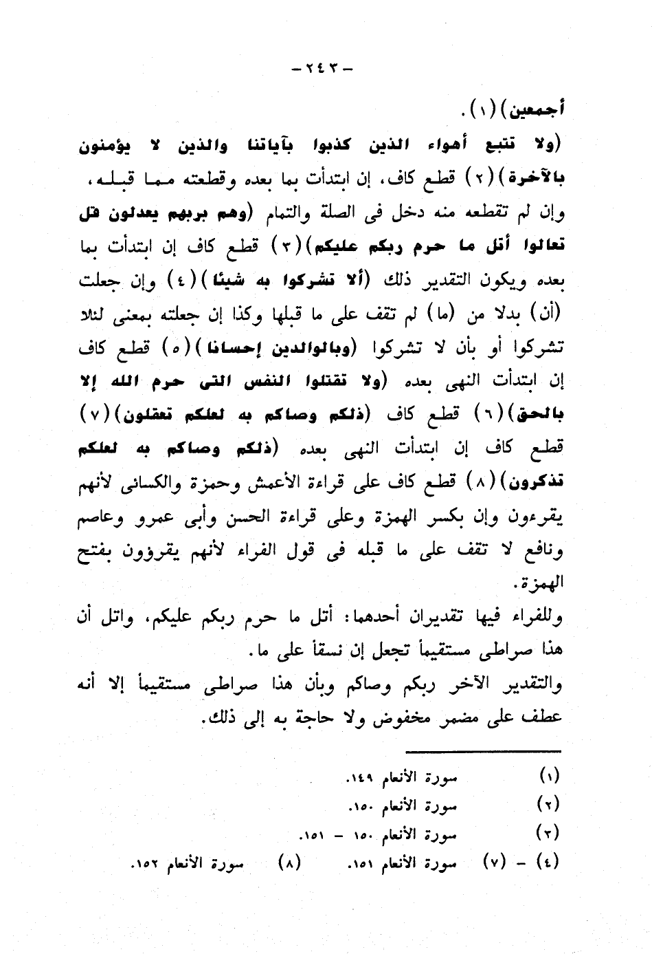 {ولا تتبع أهواء الذين كذبوا بآياتنا والذين لا يؤمنون بالآخرة} قطع كاف، إن ابتدأت بما بعده وقطعته مما قبله، وإن لم تقطعه منه دخل في الصلة والتمام {وهم بربهم يعدلون قل تعالوا أتل ما حرم ربكم عليكم} قطع كاف إن ابتدأت بما بعده ويكون التقدير ذلك {ألا تشركوا به شيئا} وإن جعلت (أن) بدلا من (ما) لم تقف على ما قبلها وكذا إن جعلته بمعنى لئلا تشركوا أو بأن لا تشركوا {وبالوالدين إحسانا} قطع كاف إن ابتدأت النهي بعده {ولا تقتلوا النفس التي حرم الله إلا بالحق} قطع كاف {ذلك وصاكم به لعلكم تعقلون} قطع كاف إن ابتدأت النهي بعده {ذلكم وصاكم به لعلكم تذكرون} قطع كاف على قراءة الأعمش وحمزة والكسائي لأنهم يقرءون وإن بكسر الهمزة وعلى قراءة الحسن وأبي عمرو وعاصم ونافع لا تقف على ما قبله في قول الفراء لأنهم يقرؤون بفتح الهمزة.