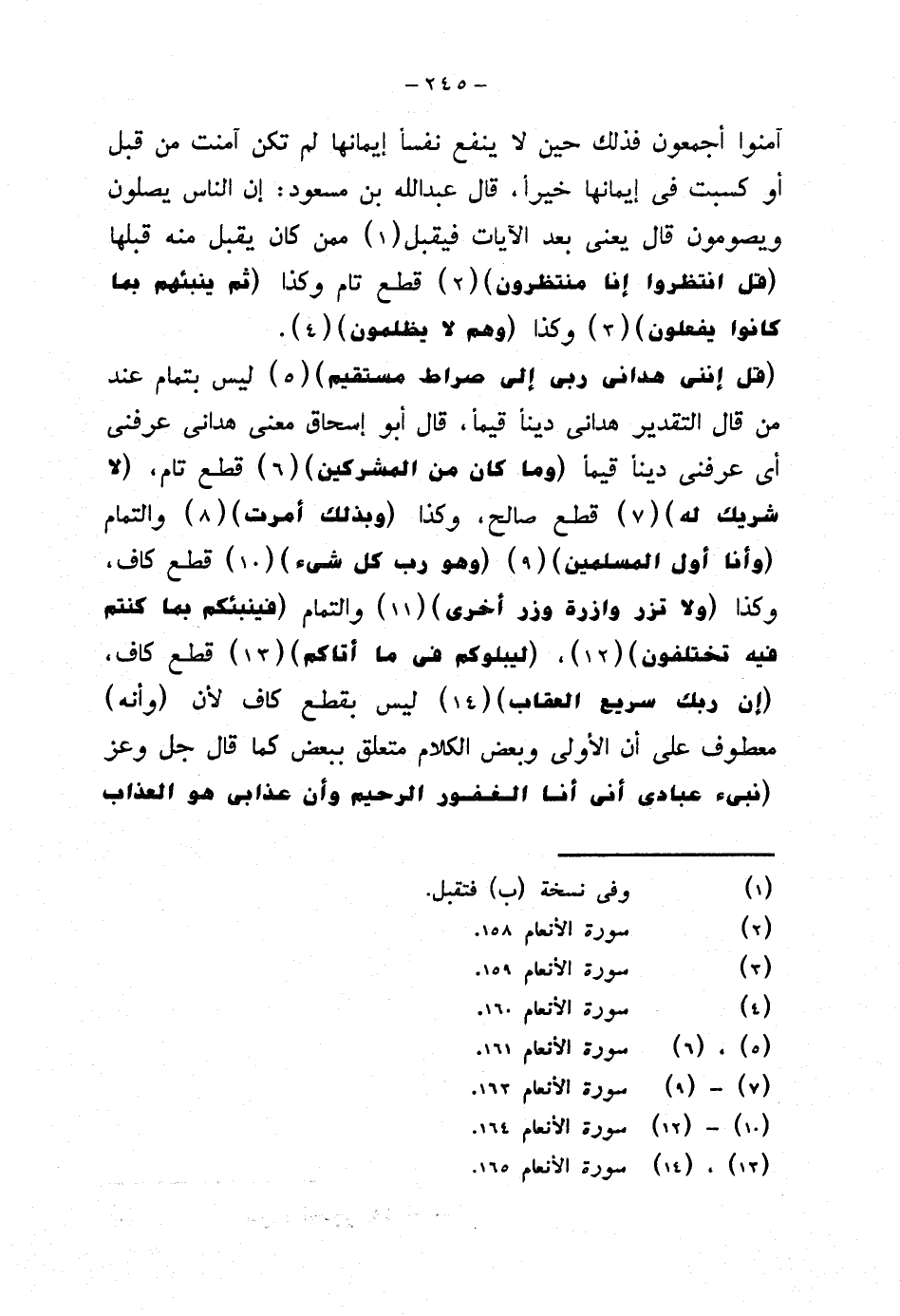 {قل إنني هداني ربي إلى صراط مستقيم} ليس بتمام عند من قال التقدير هداني دينًا قيمًا، قال أبو إسحاق معنى هداني عرفني أي عرفني دينًا قيمًا {وما كان من المشركين} قطع تام، {لا شريك له} قطع صالح، وكذا {وبذلك أمرت} والتمام {وأنا أول المسلمين} {وهو رب كل شيء} قطع كاف، وكذا {ولا تزر وازرة وزر أخرى} والتمام {فينبئكم بما كنتم فيه تختلفون}، {ليبلوكم في ما أتاكم} قطع كاف، {إن ربك سريع العقاب} ليس بقطع كاف لأن (وأنه) معطوف على أن الأولى وبعض الكلام متعلق ببعض كما قال جل وعز {نبئ عبادي أني أنا الغفور الرحيم وأن عذابي هو العذاب