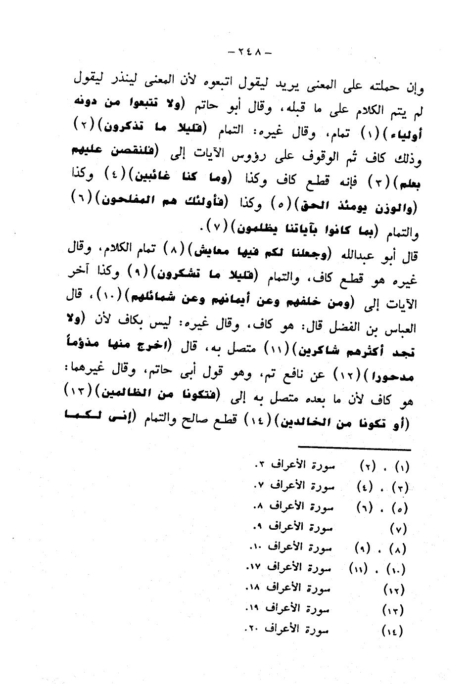 قال أبو عبد الله {وجعلنا لكم فيها معايش} تمام الكلام، وقال غيره هو قطع كاف، والتمام {قليلا ما تشكرون} وكذا آخر الآيات إلى {ومن خلفهم وعن أيمانهم وعن شمائلهم}، قال العباس بن الفضل قال: هو كاف، وقال غيره: ليس بكاف لأن {ولا تجد أكثرهم شاكرين} متصل به، قال {اخرج منها مذؤمًا مدحورا} عن نافع تم، وهو قول أبي حاتم، وقال غيرهما: هو كاف لأن ما بعده متصل به إلى {فتكونا من الظالمين} {أو تكونا من الخالدين} قطع صالح والتمام {إني لكما