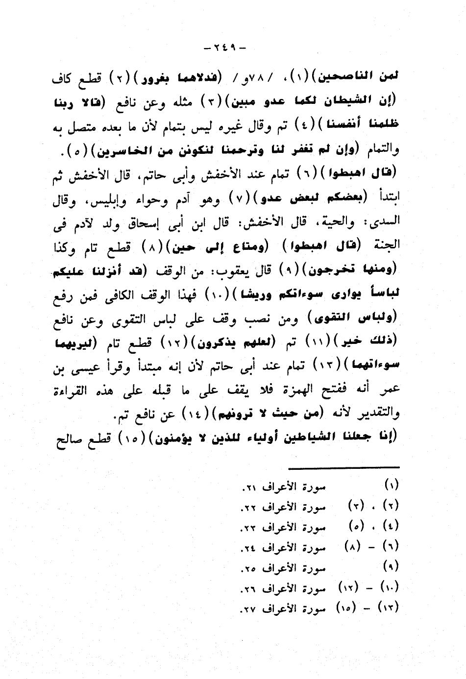 لمن الناصحين} {فدلاهما بغرور} قطع كاف {إن الشيطان لكما عدو مبين} مثله وعن نافع {قالا ربنا ظلمنا أنفسنا} تم وقال غيره ليس بتمام لأن ما بعده متصل به والتمام {وإن لم تغفر لنا وترحمنا لنكونن من الخاسرين}.
