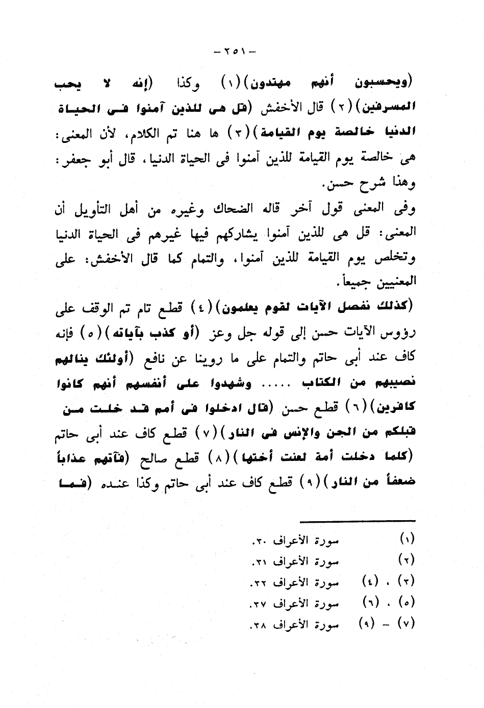 {كذلك نفصل الآيات لقوم يعلمون} قطع تام تم الوقف على رؤوس الآيات حسن إلى قوله جل وعز {أو كذب بآياته} فإنه كاف عند أبي حاتم والتمام على ما روينا عن نافع {أولئك ينالهم نصيبهم من الكتاب ... وشهدوا على أنفسهم أنهم كانوا كافرين} قطع حسن {قال ادخلوا في أمم قد خلت من قبلكم من الجن والإنس في النار} قطع كاف عند أبي حاتم {كلما دخلت أمة لعنت أختها} قطع صالح {فآتهم عذابًا ضعفًا من النار} قطع كاف عند أبي حاتم وكذا عنده {فما
