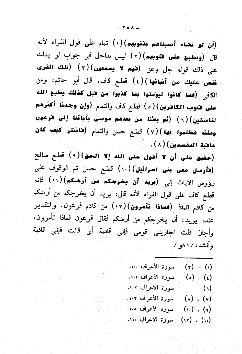 {أن لو نشاء أصبناهم بذنوبهم} تمام على قول الفراء لأنه قال {ونطبع على قلوبهم} ليس بداخل في جواب لو يدلك على ذلك قوله جل وعز {فهم لا يسمعون} {تلك القرى نقص عليك من أنبائها} قطع كاف، قال أبو حاتم: ومن الكافي {فما كانوا ليؤمنوا بما كذبوا من قبل كذلك يطبع الله على قلوب الكافرين} قطع كاف والتمام {وإن وجدنا أكثرهم لفاسقين} {ثم بعثنا من بعدهم موسى بآياتنا إلى فرعون وملئه فظلموا بها} قطع حسن والتمام {فانظر كيف كان عاقبة المفسدين}.