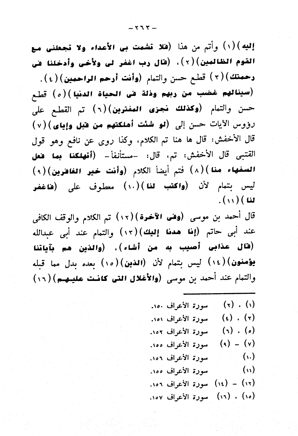 قال أحمد بن موسى {وفي الآخرة} تم الكلام والوقف الكافي عند أبي حاتم {إنا هدنا إليك} والتمام عند أبي عبد الله {قال عذابي أصيب به من أشاء}، {والذين هم بآياتنا يؤمنون} ليس بتمام لأن {الذين} بعده بدل مما قبله والتمام عند أحمد بن موسى {والأغلال التي كانت عليهم}