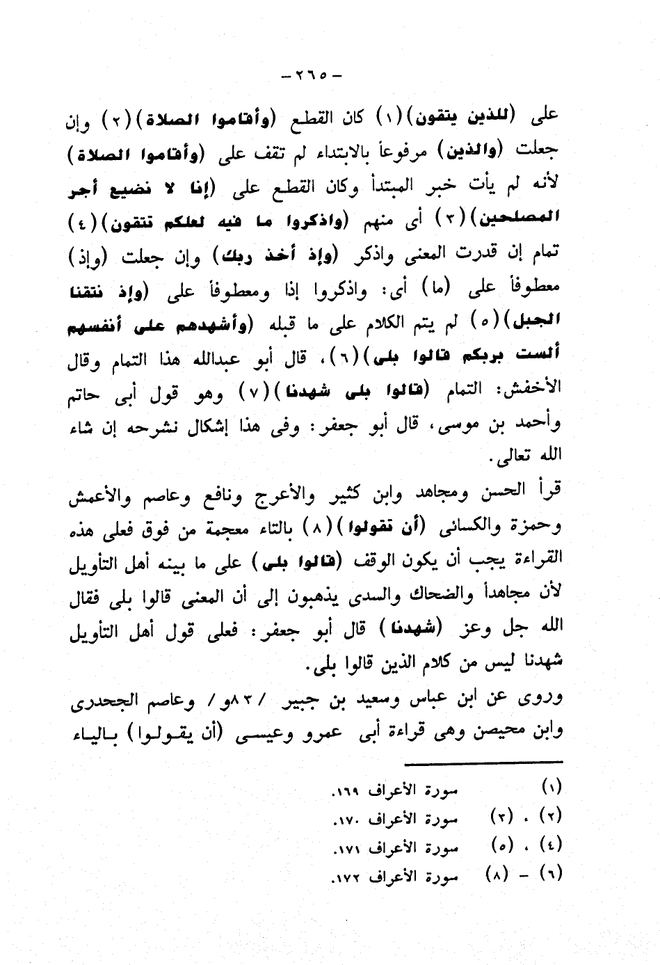 على {للذين يتقون} كان القطع {وأقاموا الصلاة} وإن جعلت (والذين) مرفوعًا بالابتداء لم تقف على (وأقاموا الصلاة) لأنه لم يأت خبر المبتدأ وكان القطع على {إنا لا نضيع أجر المصلحين} أي منهم {واذكروا ما فيه لعلكم تتقون} تمام إن قدرت المعنى واذكر (وإذ أخذ ربك) وإن جعلت (وإذ) معطوفًا على (ما) أي: واذكروا إذا ومعطوفًا على {وإذ نتقنا الجبل} لم يتم الكلام على ما قبله {وأشهدهم على أنفسهم ألست بربكم قالوا بلى}، قال أبو عبد الله هذا التمام وقال الأخفش: التمام {قالوا بلى شهدنا} وهو قول أبي حاتم وأحمد بن موسى، قال أبو جعفر: وفي هذا إشكال نشرحه إن شاء الله تعالى.