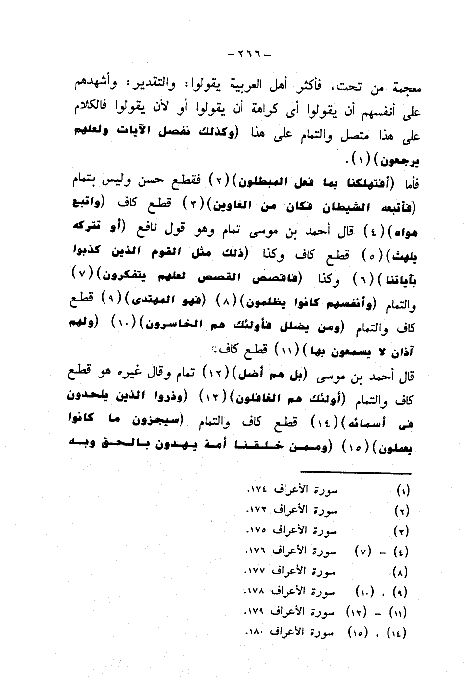 فأما {أفتهلكنا بما فعل المبطلون} فقطع حسن وليس بتمام {فأتبعه الشيطان فكان من الغاوين} قطع كاف {واتبع هواه} قال أحمد بن موسى تمام وهو قول نافع {أو تتركه يلهث} قطع كاف وكذا {ذلك مثل القوم الذين كذبوا بآياتنا} وكذا {فاقصص القصص لعلهم يتفكرون} والتمام {وأنفسهم كانوا يظلمون} {فهو المهتدي} قطع كاف والتمام {ومن يضلل فأولئك هم الخاسرون} {ولهم آذان لا يسمعون بها} قطع كاف.