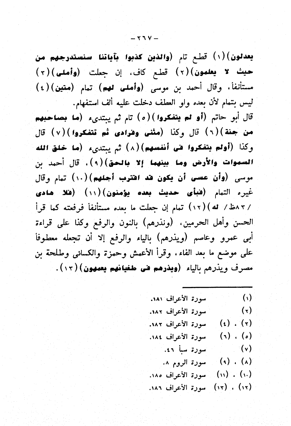 قال أبو حاتم {أو لم يتفكروا} تام ثم يبتدئ {ما بصاحبهم من جنة} قال وكذا {مثنى وفرادى ثم تتفكروا} قال وكذا {أولم يتفكروا في أنفسهم} ثم يتبدئ {ما خلق الله السموات والأرض وما بينهما إلا بالحق}، قال أحمد بن موسى {وأن عسى أن يكون قد اقترب أجلهم} تمام وقال غيره التمام {فبأي حديث بعده يؤمنون} {فلا هادي له} تمام إن جعلت ما بعده مستأنفا فرفعته كما قرأ الحسن وأهل الحرمين، (ونذرهم) بالنون والرفع وكذا على قراءة أبي عمرو وعاصم (ويذرهم) بالياء والرفع إلا أن تجعله معطوفًا على موضع ما بعد الفاء، وقرأ الأعمش وحمزة والكسائي وطلحة بن مصرف ويذرهم بالياء {ويذرهم في طغيانهم يعمهون}.
