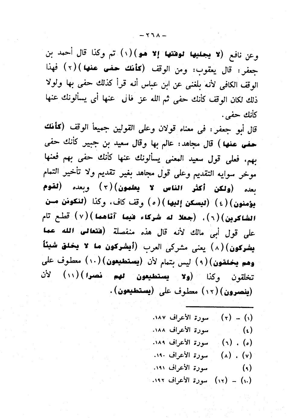 قال أبو جعفر: في معناه قولان وعلى القولين جميعًا الوقف (كأنك حفي عنها) قال مجاهد: عالم بها وقال سعيد بن جبير كأنك حفي بهم، فعلى قول سعيد المعنى يسألونك عنها كأنك حفي بهم فعنها مؤخر سوايه التقديم وعلى قول مجاهد بغير تقديم ولا تأخير التمام بعده {ولكن أكثر الناس لا يعلمون} وبعده {لقوم يؤمنون} {ليسكن إليها} وقف كاف، وكذا {لنكونن من الشاكرين}، {جعلا له شركاء فيما آتاهما} قطع تام على قول أبي مالك لأنه قال هذه منفصلة {فتعالى الله عما يشركون} يعني مشركي العرب {أيشركون ما لا يخلق شيئًا وهم يخلقون} ليس بتمام لأن {يستطيعون} معطوف على تخلقون وكذا {ولا يستطيعون لهم نصرا} لأن {ينصرون} معطوف على (يستطيعون).